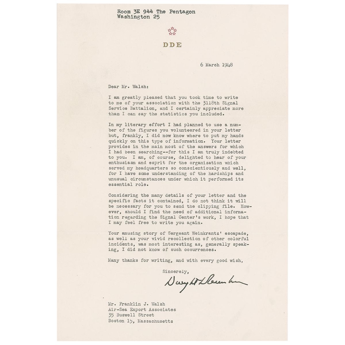 TLS, one page, 7.25 x 10.5, on personal letterhead, March 6, 1948. In a letter of gratitude for information passed on from a WWII soldier, Eisenhower writes, in full: “I am greatly pleased that you took time to write to me of your association with the 3118th Signal Service Battalion, and I certainly appreciate more than I can say the statistics you included. In my literary effort I had planned to use number of the figures you volunteered in your letter but, frankly, I did now [sic] know where to put my hands quickly on this type of information. Your letter provides in the main most of the answers for which I had been searching—for this I am truly indebted to you. I am, of course, delighted to hear of your enthusiasm and esprit for the organization which served my headquarters so conscientiously and well, for I have some understanding of the hardships and unusual circumstances under which it performed its essential role. Considering the many details of your letter and the specific facts it contained, I do not think it will be necessary for you to send the clipping file. However, should I find the need of additional information regarding the Signal Center’s work, I hope that I may feel free to write you again. Your amusing story of Sergeant Weinkrantz’s escapade, as well as your vivid recollection of other colorful incidents, was most interesting to us, generally speaking, I did not know of such occurrences.” In fine condition.