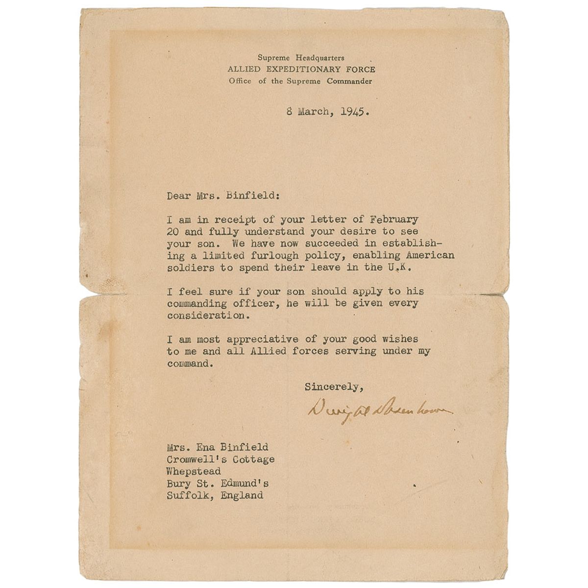 War-dated TLS, one page, 6 x 8, Supreme Headquarters Allied Expeditionary Force letterhead, March 8, 1945. In a letter to Mrs. Ena Binfield, mother of a solider serving under the Supreme Commander, Eisenhower writes, in full: “I am in receipt of your letter of February 20 and fully understand your desire to see your son. We have now succeeded in establishing a limited furlough policy, enabling American soldiers to spend their leave in the U. K. I feel sure if your son should apply to his commanding officer, he will be given every consideration. I am most appreciative of your good wishes to me and all Allied forces serving under my command.” In very good condition, with central horizontal and vertical fold, scattered wrinkling and creasing, a faint black of overall toning, small areas of separation at each end of the horizontal fold, and tape to the top edge of the reverse.
