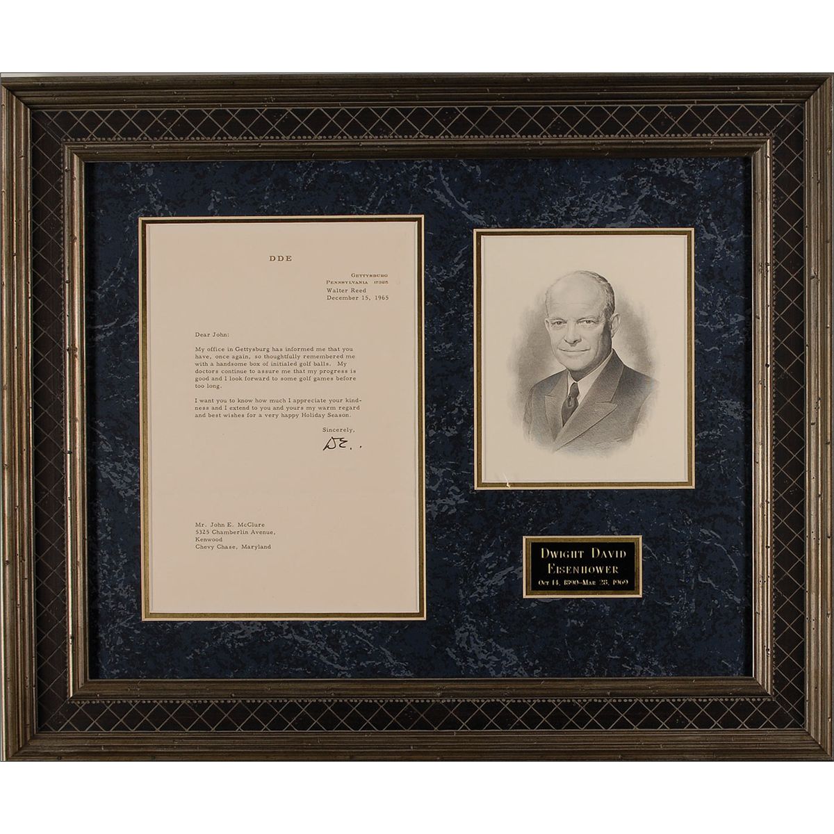 TLS signed “D. E.,” one page, 7 x 10.5, personal letterhead, December 15, 1965. Letter of thanks written from Walter Reed Hospital. In part: “My office in Gettysburg has informed me that you have, once again, so thoughtfully remembered me with a handsome box of initialled golf balls. My doctors continue to assure me that my progress is good and I look forward to some golf games before too long.” Double matted and framed with an engraved portrait of Eisenhower and a small name plaque to an overall size of 21.5 x 17.5. In fine condition.