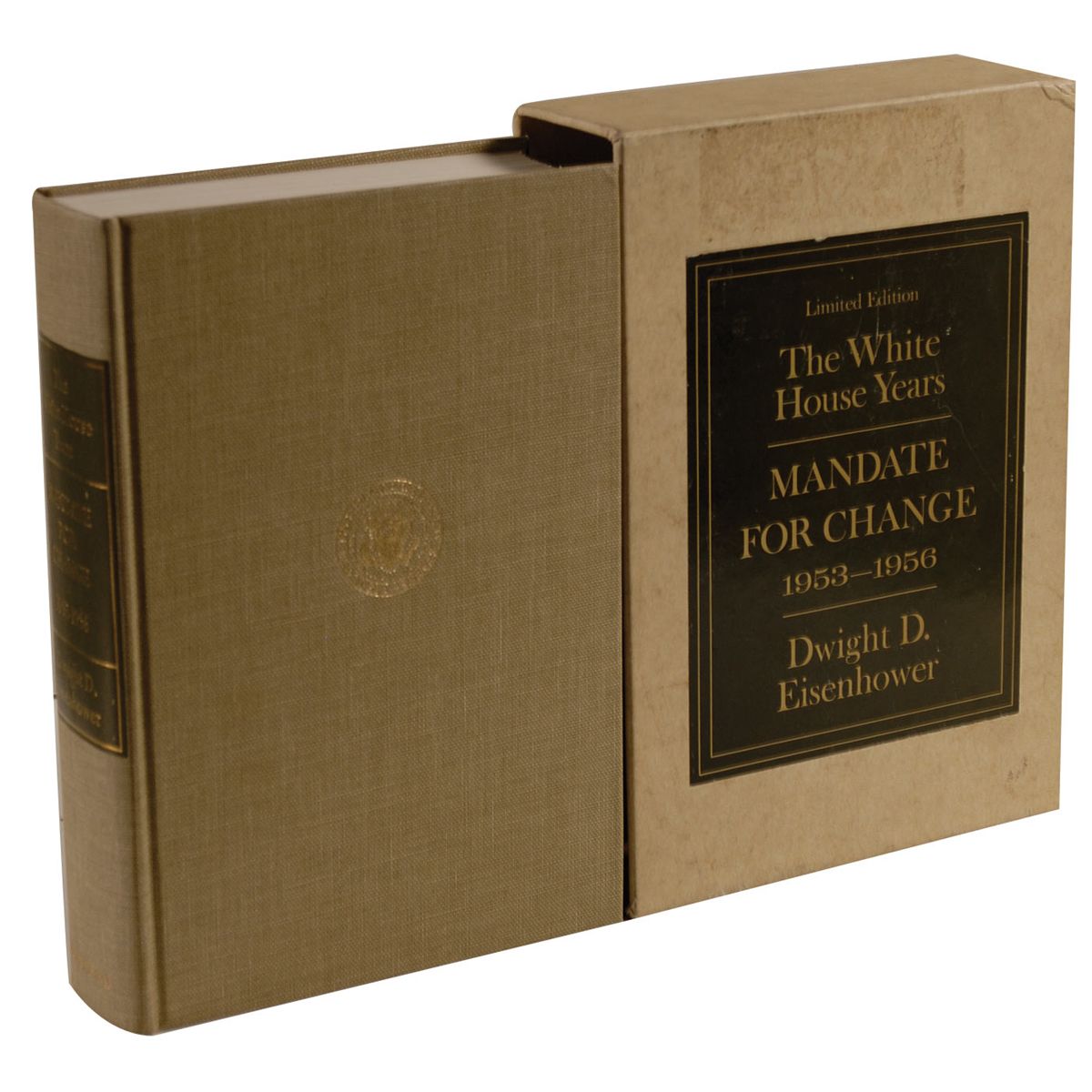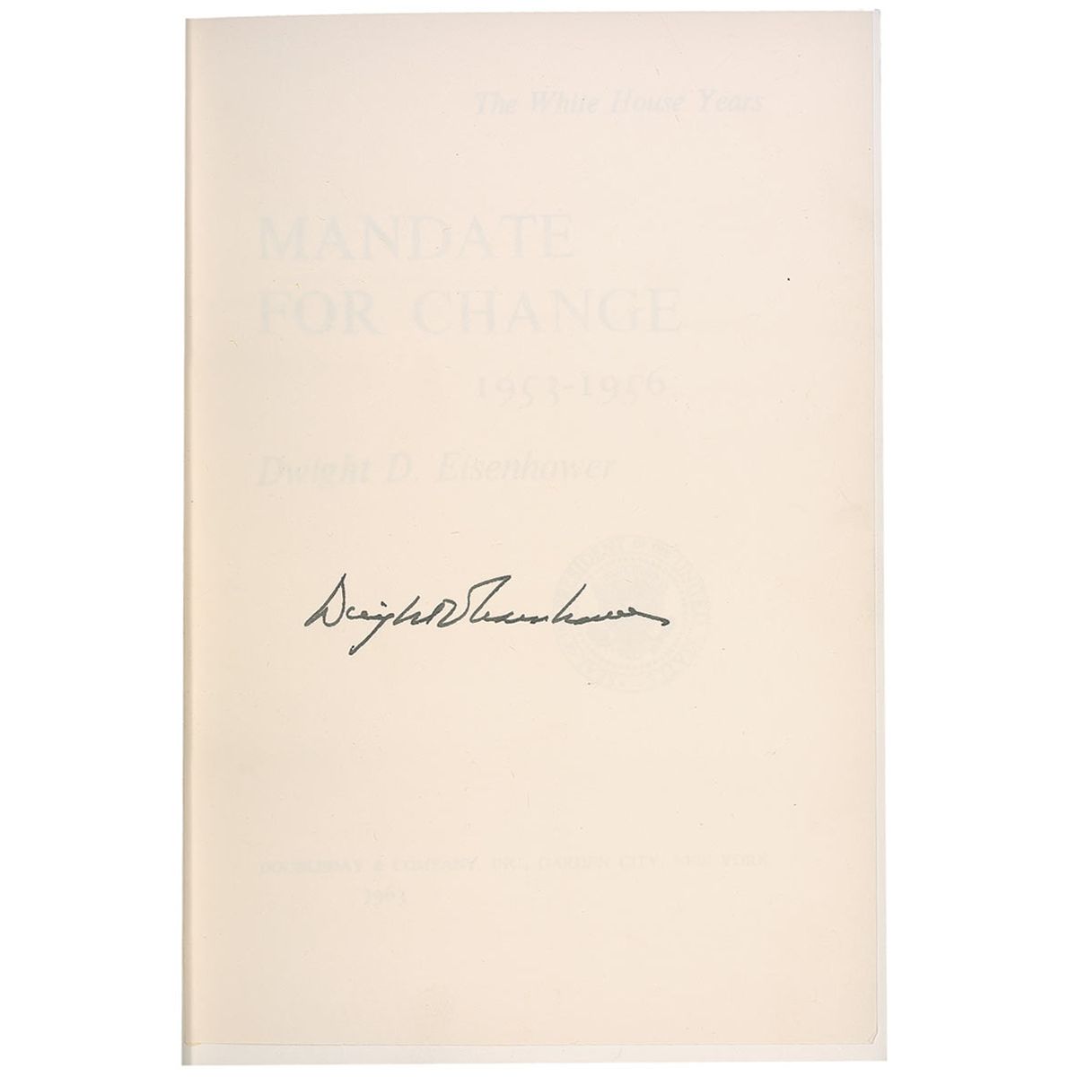 Fantastic signed book: The White House Years: Mandate for Change. Limited edition first edition of 1500 copies, this being No. 879. NY: Doubleday, 1963. Hardcover with slipcase, 6.5 x 9.5, 650 pages. Signed in black ink on the second free end page, “Dwight D. Eisenhower.” In fine condition, with light wear, soiling and adhesive remnant to the slipcase.
