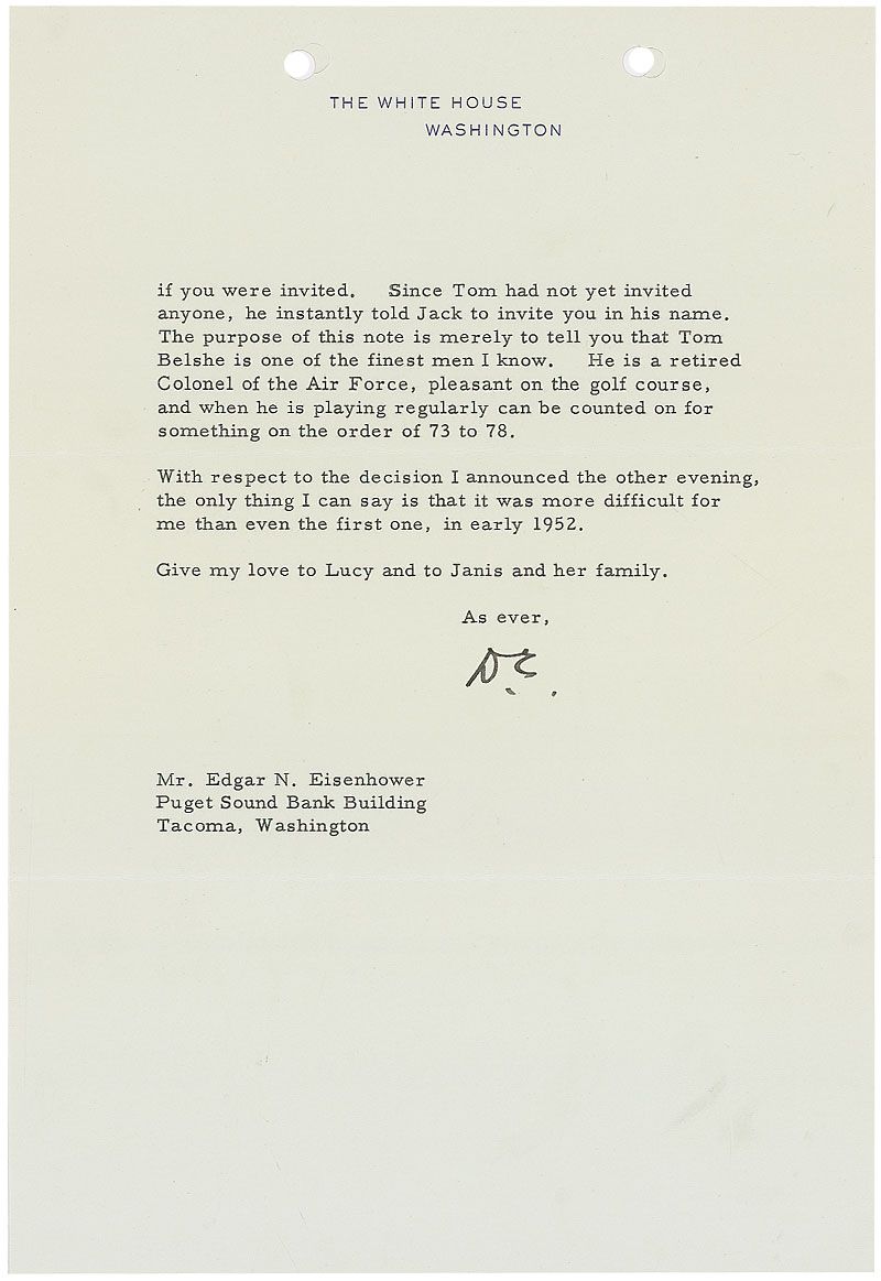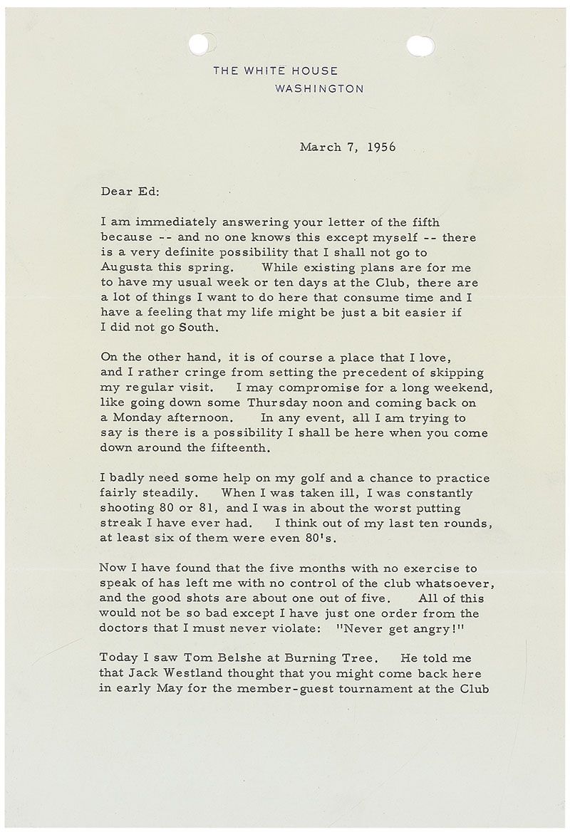 TLS as president signed “D. E.,” two pages, 7 x 10.25, White House letterhead, March 7, 1956. Letter to Edgar Eisenhower. In part: “There is a very definite possibility that I shall not go to Augusta this spring. While exisiting plans are for me to have my usual week or ten days at the Club, there are a lot of things I want to do here that consume time and I have a feeling that my life might be just a bit easier if I did not go South. On the other hand, it is of course a place that I love, and I rather cringe from setting the precedent of skipping my regular visit…I badly need some help on my golf and a chance to practice fairly steadily. When I was taken ill, I was constantly shooting 80 or 81, and I was in about the worst putting streak I have ever had…Now I have found that the five months with no exercise to speak of has left me with no control of the club whatsoever, and the good shots are about one out of five. All of this would not be so bad except I have just one order from the doctors that I must never violate: ‘Never get angry!’” In fine condition, with punch holes to top edge. Eisenhower was particularly fond of Augusta National, and is memorialized there by the Eisenhower Tree, Ike’s Dam, and the Eisenhower Cabin, built by the club for Eisenhower after his election, and constructed to strict Secret Service security guidelines.