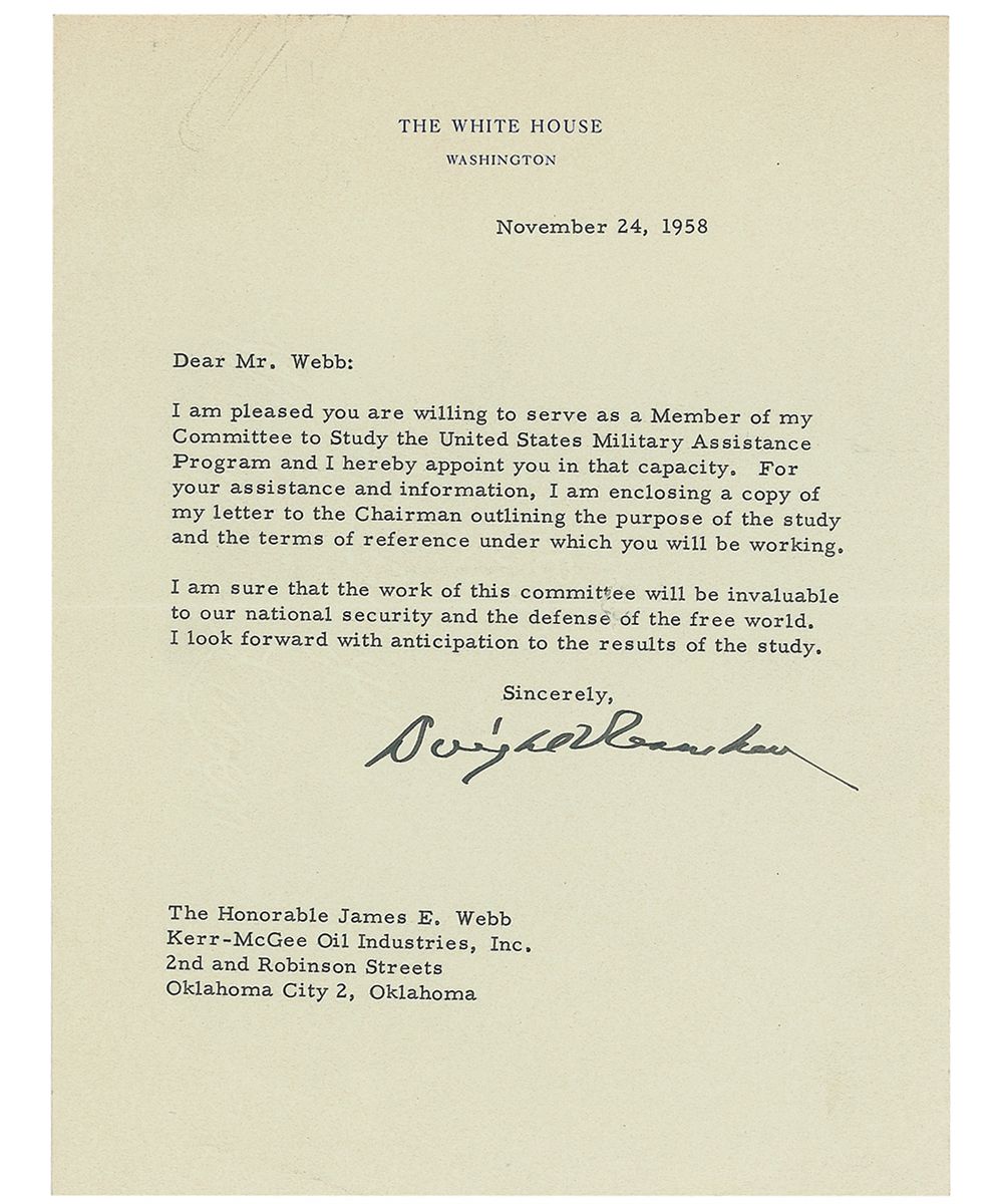 TLS as president, one page, 6.75 x 9, White House letterhead, November 24, 1958. Letter to James E. Webb, of Ker-McGee Oil Industries. In full: “I am pleased you are willing to serve as a Member of my Committee to Study the United States Military Assistance Program and I hereby appoint you in that capacity. For your assistance and information, I am enclosing a copy of my letter to the Chairman outlining the purpose of the study and the terms of reference under which you will be working. I am sure that the work of this committee will be invaluable to our national security and the defense of the free world. I look forward with anticipation to the results of the study.” In fine condition, with several paperclip impressions to top edge and a few scattered creases. The committee was a bipartisan committee created in November 1958 by President Eisenhower to undertake a completely independent, objective, and non-partisan analysis of the military assistance aspects of the US Mutual Security Program.