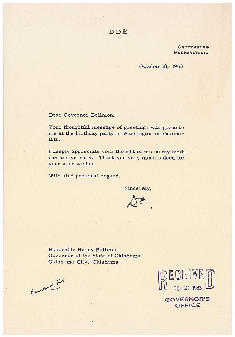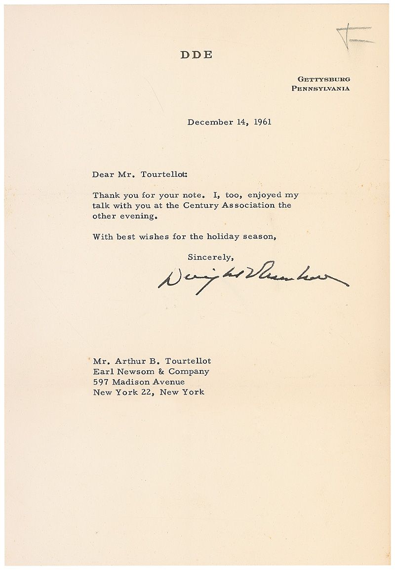 Two one-page TLSs, both 7 x 10 on his personal letterhead. One dated December 14, 1961, signed “Dwight D. Eisenhower,” the other dated October 18, 1963, signed “D. E.” Pencil notation to top of one letter, and an office stamp, notation, and crease to bottom of other letter, otherwise fine condition.