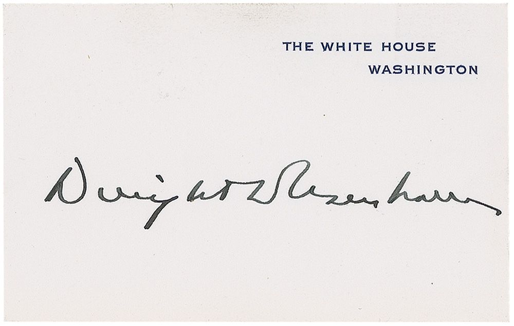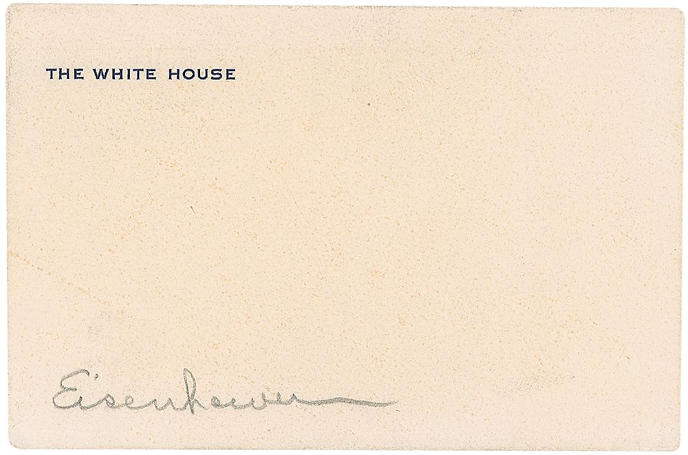 White House card nicely signed in black ink, “Dwight D. Eisenhower.” In fine condition, with a light paperclip impression to top right and a couple trivial spots. Accompanied by the original embossed White House transmittal envelope.