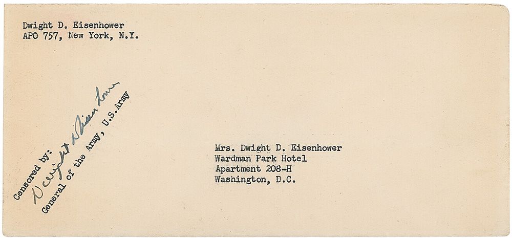 Off-white U. S. Forces, European Theater envelope, 8.25 x 3.75, sent by Eisenhower to his wife, and signed in the lower left with a censoring signature, “Dwight D. Eisenhower.” In fine condition, with a uniform shade of toning and light scattered creases.