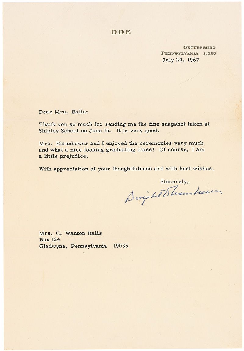 TLS, one page, 7 x 10.25, personal letterhead, July 20, 1967. Letter of thanks for a sent photo. In part: “Thank you so much for sending me the fine snapshot taken at Shipley School on June 15. It is very good. Mrs. Eisenhower and I enjoyed the ceremonies very much and what a nice looking graduating class! Of course, I am a little prejudice.” In fine condition, with a couple slight creases and a trivial spot of foxing to right edge. Accompanied by the original mailing envelope. Eisenhower had recently delivered the commencement address at his granddaughter Ann’s graduation.