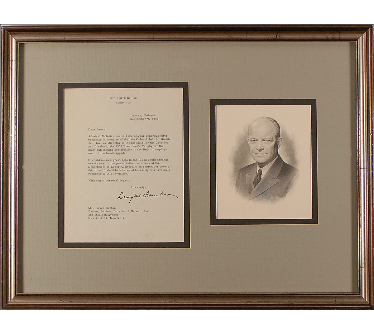 TLS as president, one page, 6.5 x 8.5, White House letterhead, September 9, 1953. Letter to former congressman and advertising executive Bruce Barton. In part: “Admiral McIntire has told me of your generous offer to donate in the memory of the late Colonel John N. Smith, Jr., former Director of the Institute for the Crippled and Disabled, the 1953 President’s Trophy for the most outstanding contribution in the field of employment of the handicapped. It would mean a great deal to me if you could arrange to take part in the presentation ceremony.” Double matted and framed with an engraved portrait to an overall size of 20.75 x 16. In fine condition, with some mild toning and pencil remnants to bottom.