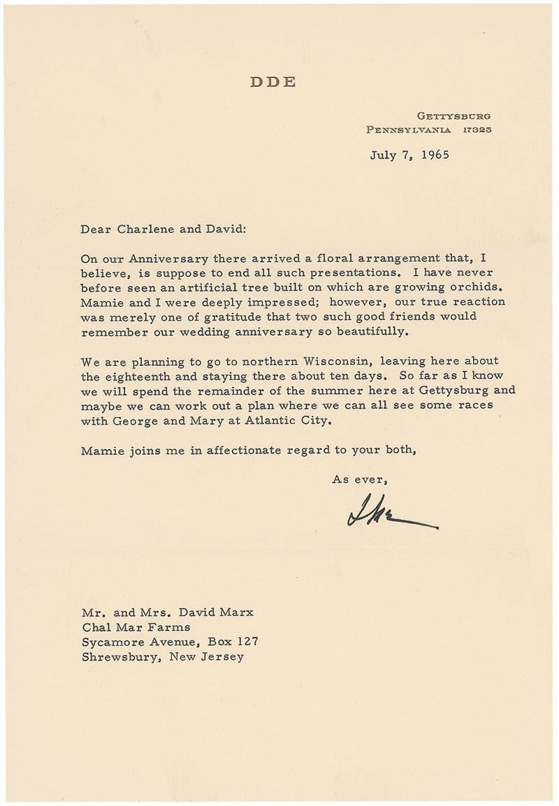 TLS signed “Ike,” one page, 7 x 10.25, personal letterhead, July 7, 1965. Letter to Charlene and David Marx of the Marx toy company. In part: “On our Anniversary there arrived a floral arrangement that, I believe, is suppose to end all such presentations. I have never before seen an artificial tree built on which are growing orchids. Mamie and I were deeply impressed; however, our true reaction was merely one of gratitude that two such good friends would remember our wedding anniversary so beautifully.” In fine condition.