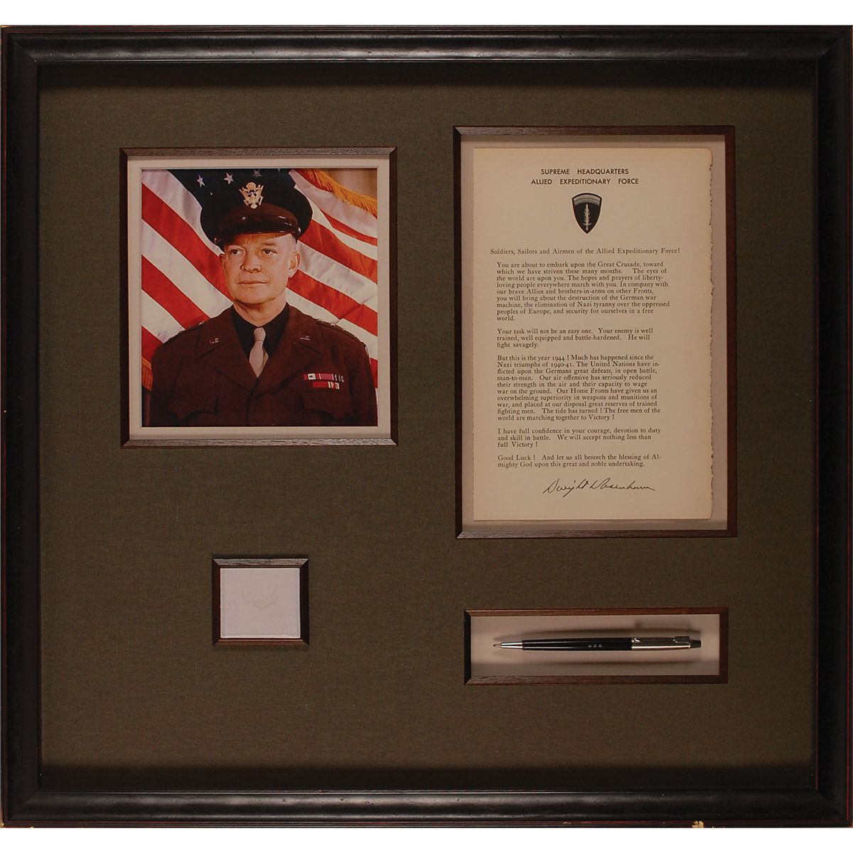 Souvenir D-Day Order removed from one of Eisenhower’s limited edition Crusade in Europe books, 5.75 x 9, of General Dwight Eisenhower’s Order of the Day on June 6, 1944, delivered upon the D-Day invasion of France. The order reads, in part: “Soldiers, Sailors and Airmen of the Allied Expeditionary Forces: You are about to embark upon the Great Crusade, toward which we have striven these many months. The eyes of the world are upon you. The hopes and prayers of liberty-loving people everywhere march with you…But this is the year 1944! Much has happened since the Nazi triumphs of 1940-41. The United Nations have inflicted upon the Germans great defeats, in open battle, man-to-man. Our air offensive has seriously reduced their strength in the air and their capacity to wage war on the ground. Our Home Fronts have given us an overwhelming superiority in weapons and munitions of war, and placed at our disposal great reserves of trained fighting men. The tide has turned!” Signed at the conclusion in black ink by Eisenhower.