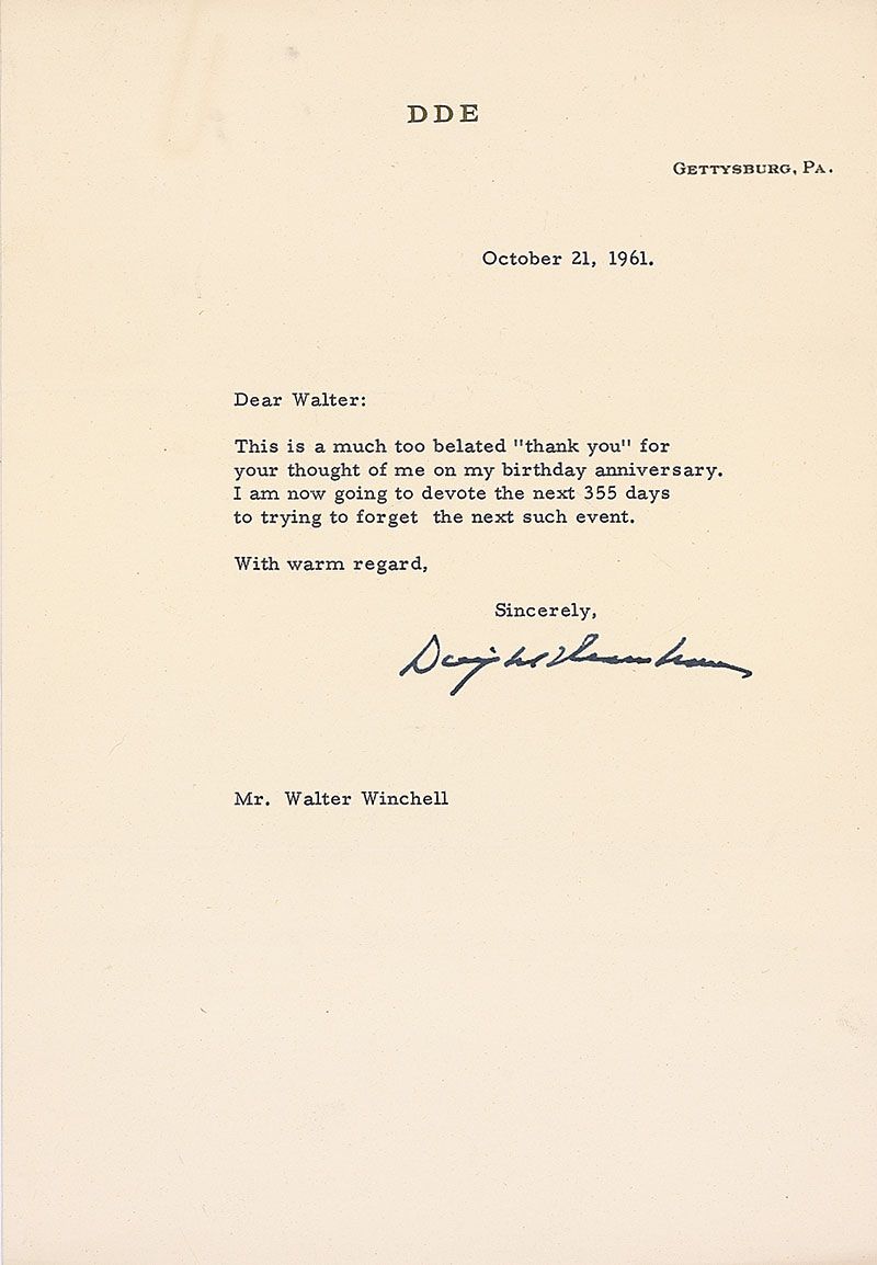 TLS, one page, 7 x 10.25, personal letterhead, Gettysburg, October 21, 1961. Letter to Walter Winchell of the New York Mirror. In full: “This is a much too belated ‘thank you’ for your thought of me on my birthday anniversary. I am now going to devote the next 355 days to trying to forget the next such event.” Eisenhower’s signature is incredibly bold and crisp. In fine condition, with a few light impressions and a paperclip mark to the upper border. Accompanied by the original mailing envelope.