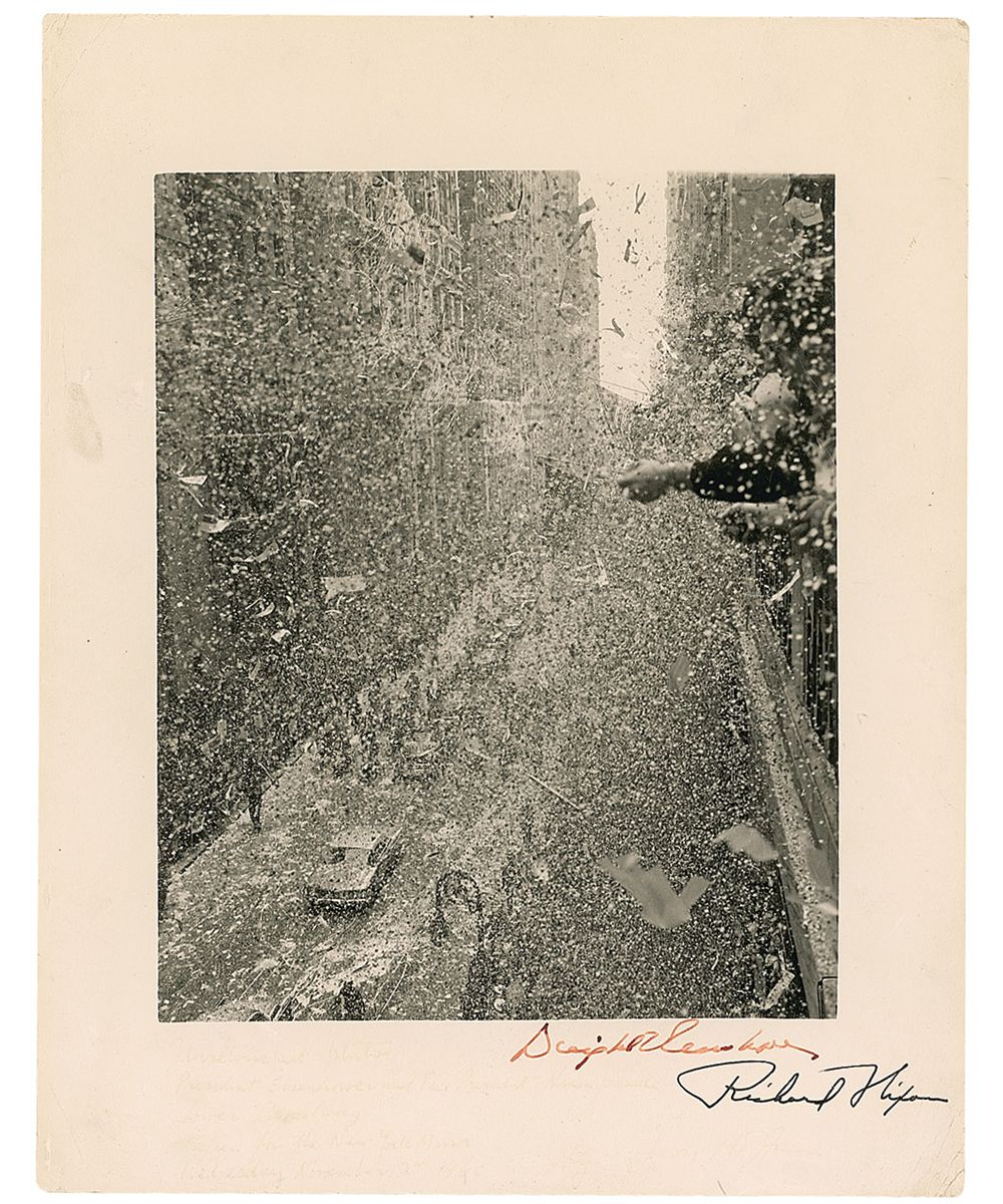Vintage matte-finish 11 x 14 photo of the ticker tape parade for Nixon and Eisenhower on Broadway in 1960, signed in the lower border in fountain pen by Eisenhower. Nixon’s signature is secretarial. In very good condition, with scattered surface marks and creases to borders, impressions to lower border from a notation describing the image, and the signature a shade light.