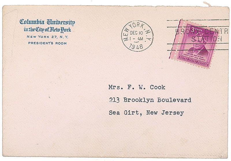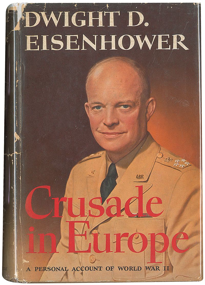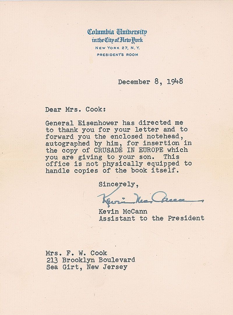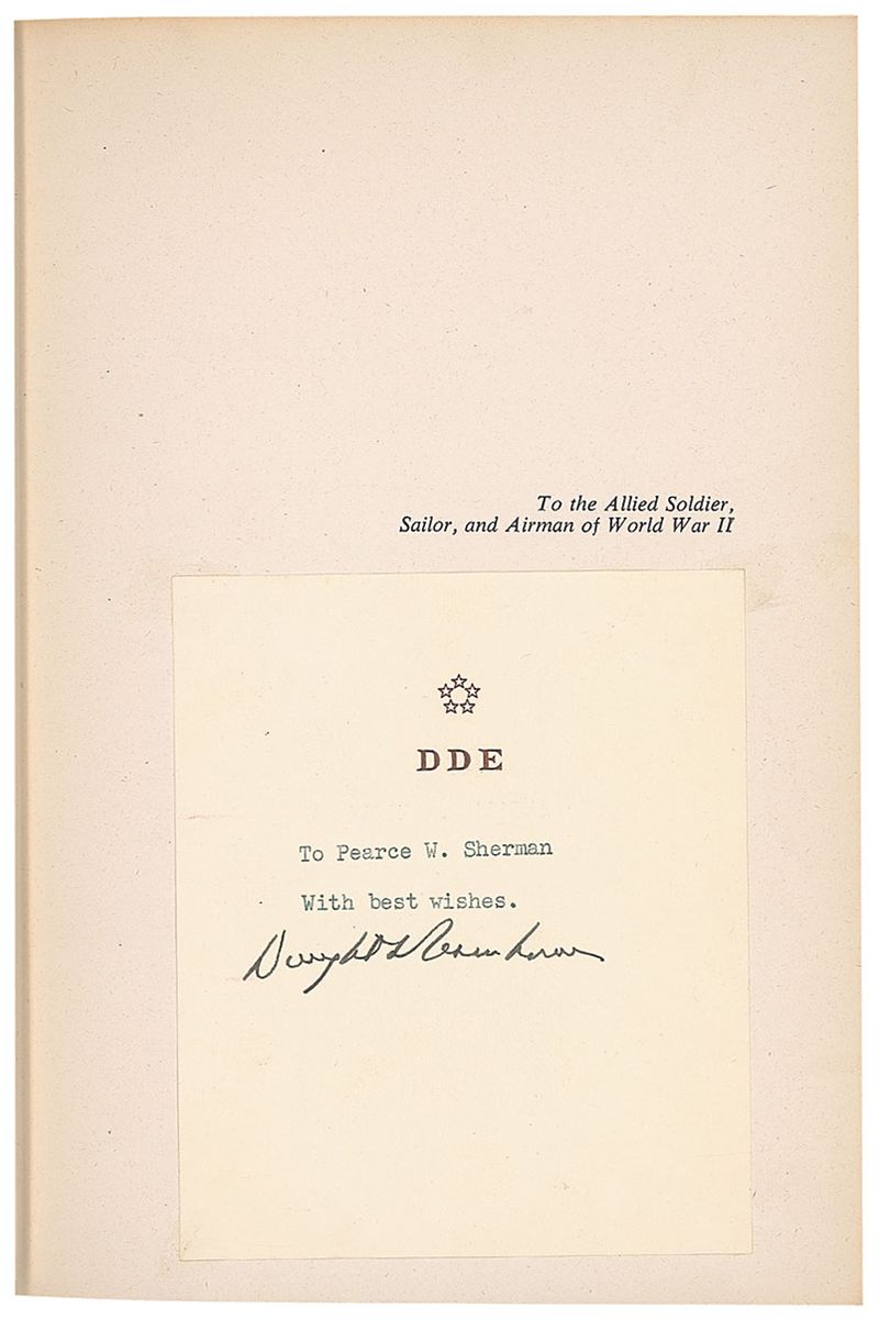 Signed book: Crusade in Europe. First edition, later printing. Garden City, NY: Doubleday, 1948. Hardcover with dust jacket, 6.25 x 8.75, 559 pages. Signed on a bookplate affixed to the dedication page in fountain pen, “Dwight D. Eisenhower,” below a typed inscription, “To Pearce W. Sherman, With best wishes.” In very good to fine condition, with light toning to pages, scattered small tears, foxing, and soiling to dust jacket, and a gift inscription to the half-title page. Accompanied by the original mailing envelope and a letter of transmittal for the bookplate from Eisenhower’s secretary, dated December 8, 1948.