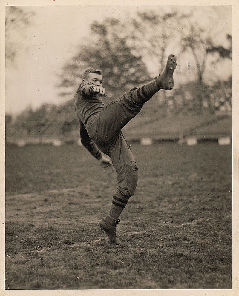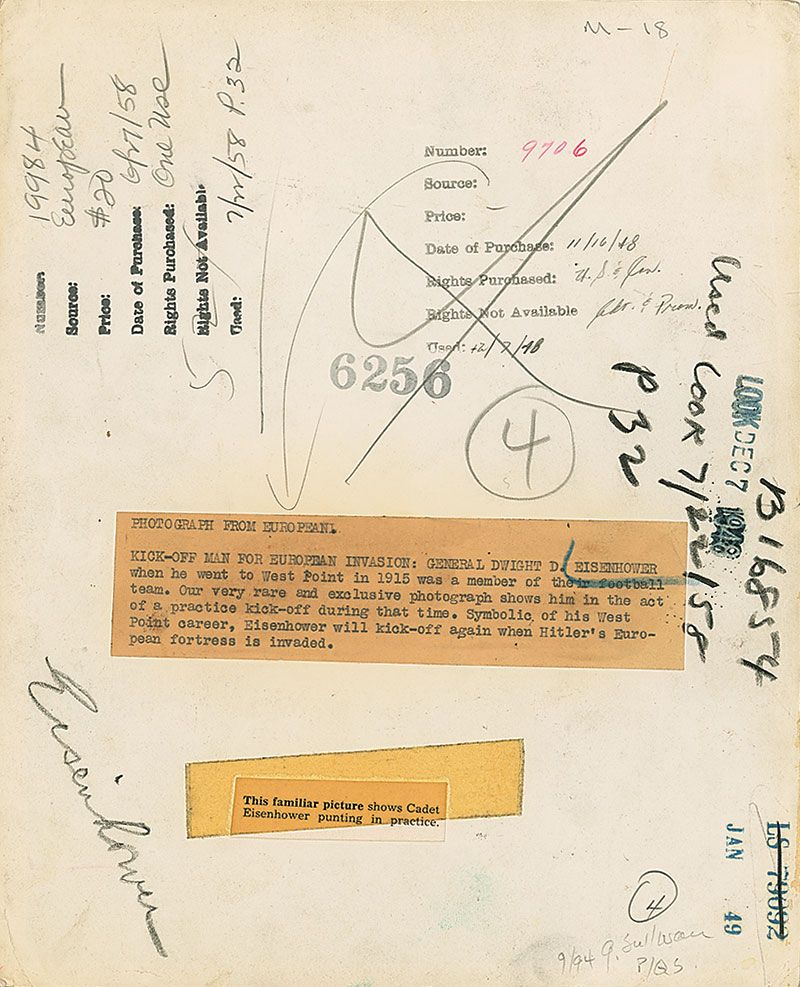 Glossy 8 x 10 press photo of Eisenhower kicking a football while a member of the West Point football team in 1915. Two captions are affixed to the reverse, one reads, in part: “Our very rare and exclusive photograph shows him in the act of a practice kick-off…Symbolic of his West Point career, Eisenhower will kick-off again when Hitler’s European fortress is invaded.” In very good condition, with light overall creases and surface marks, aforementioned captions on reverse, as well as several stamps and cropping notations.