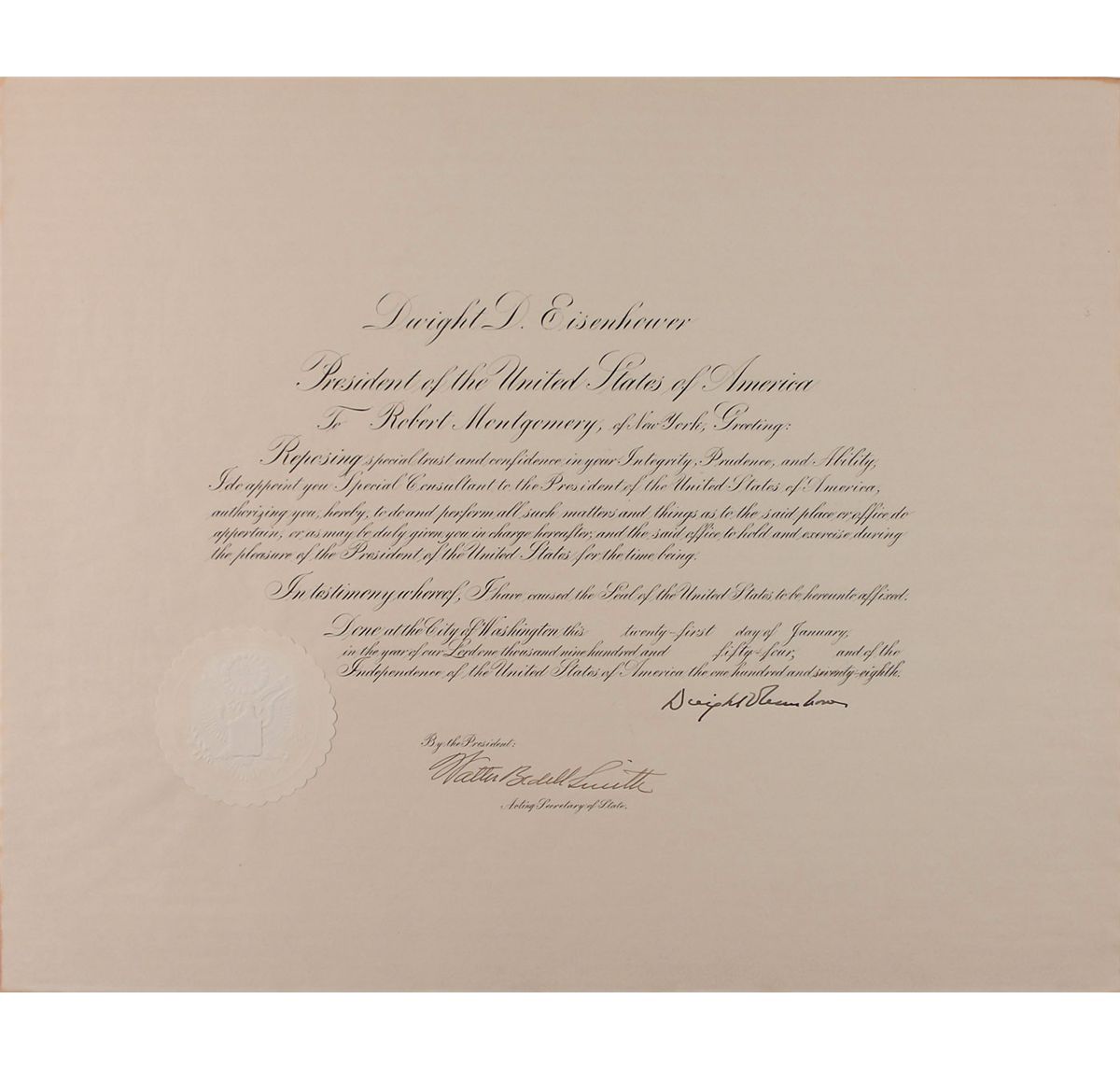 Partly-printed DS as president, one page, 23 x 19, January 21, 1954. Eisenhower appoints Robert Montgomery of New York to be a “Special Consultant to the President of the United States of America.” Signed at the conclusion by Eisenhower and countersigned by acting Secretary of State Walter Smith. In fine condition. The large paper seal is crisp and intact. Under Montgomery's careful attention, Ike became one of the most relaxed and confident speakers, especially during television debates.