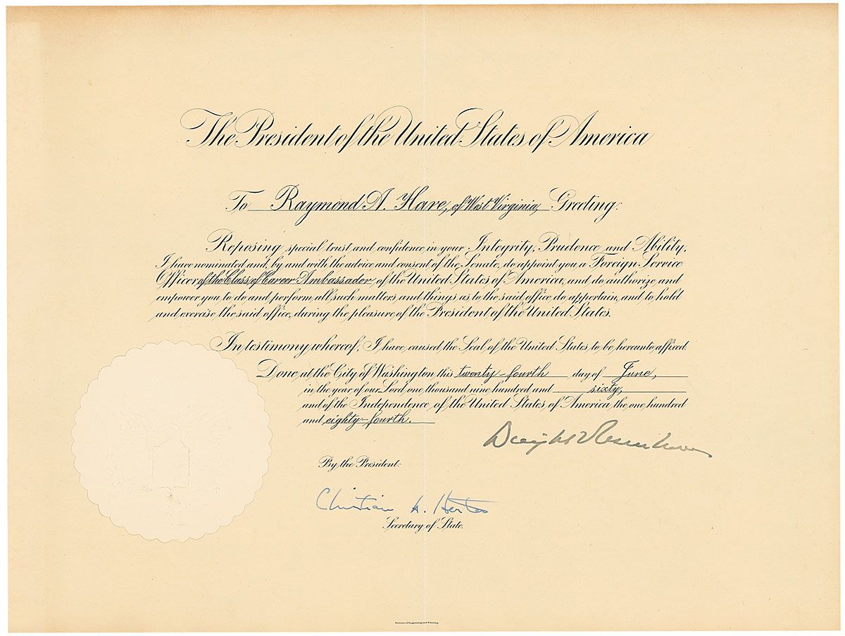 Partly-printed DS as president, one page, 15.25 x 11.5, June 24, 1960. President Eisenhower appoints Raymond A. Hare as “a Foreign Service Officer of the Class of Career Ambassador of the United States of America.” The large paper seal is very crisp and fully intact. In fine condition, with a central vertical storage fold and toning to top edge. Countersignature of Secretary of State Christian Herter appears to be autopen. Throughout his career, Hare served as ambassador to various Middle Eastern countries as well as president of the Middle East Institute.