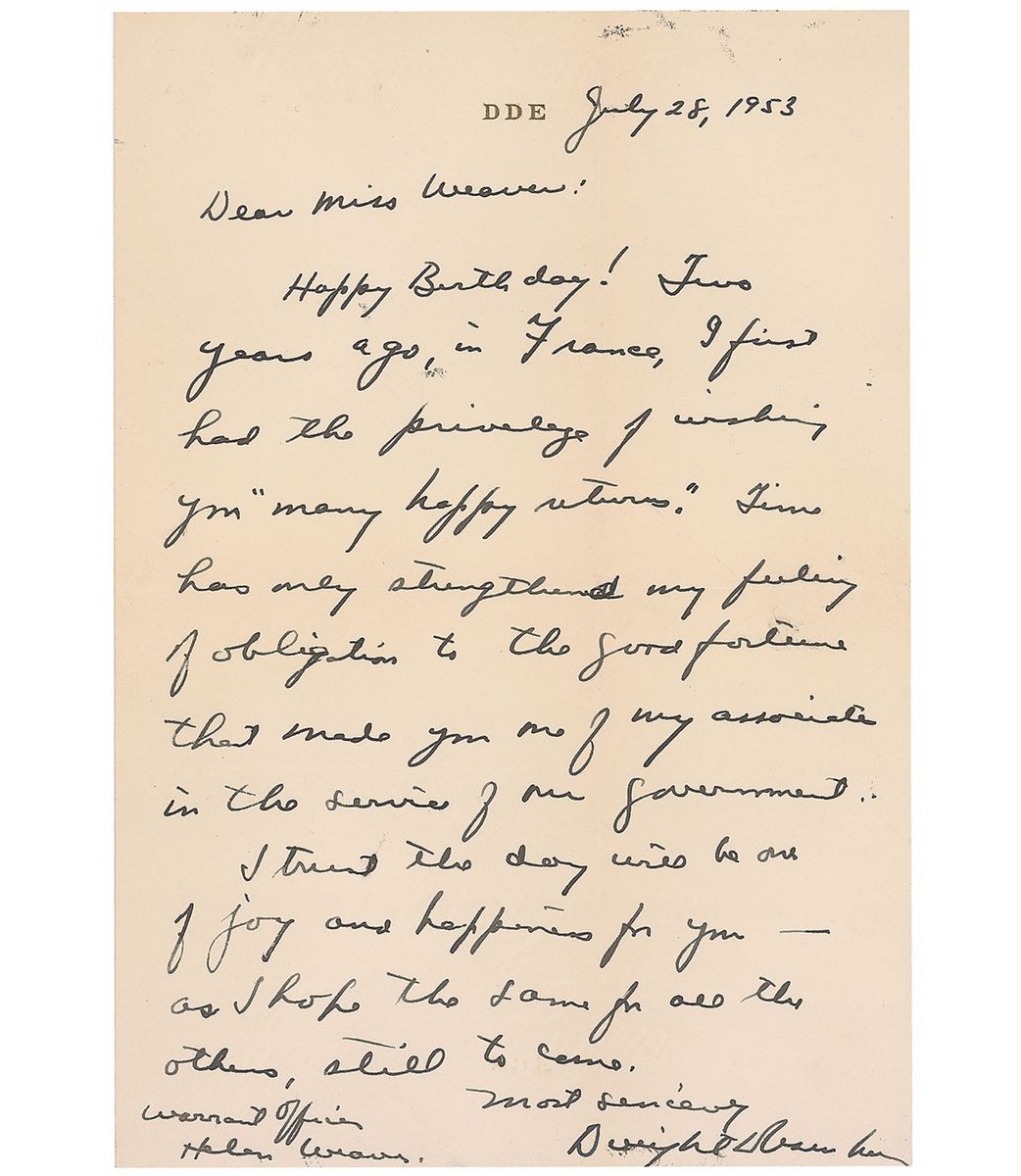 Rare and desirable ALS as president, one page, 7 x 10.25, personal letterhead, July 28, 1953. Letter to his secretary, Warrant Officer Helen Weaver. In full: “Happy Birthday! Two years ago, in France, I first had the privilege of wishing you ‘many happy returns.’ Time has only strengthened my feeling of obligation to the good fortune that made you one of my associates in the service of our government. I trust the day will be one of joy and happiness for you—as I hope the same for all the others still to come.” In fine condition, with horizontal and vertical folds, the vertical fold through a single letter of signature, and a couple light brushes to signature.