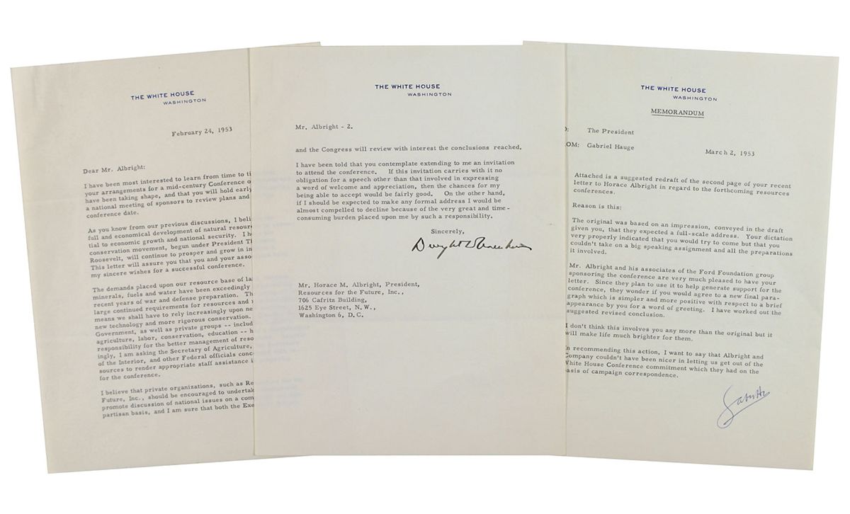 TLS as president, two pages, 8 x 10.5, White House letterhead, February 24, 1953. Letter to Horace Albright, president of Resources for the Future, Inc. In part: “I have been most interested to learn from time to time that your arrangements for a mid-century Conference on Resources have been taking shape, and that you will hold early this spring a national meeting of sponsors to review plans and set the conference date…I have been told that you contemplate extending to me an invitation to attend the conference. If this invitation carries with it no obligation for a speech other than that involved in expressing a word of welcome and appreciation, then the chances for my being able to accept would be fairly good. On the other hand, if I should be expected to make any formal address I would be almost compelled to decline because of the very great time-consuming burden placed upon me by such a responsibility.” Also included is a White House memorandum, dated March 2, 1953, to Eisenhower from Gabriel Hauge suggesting a change to the second page of the letter. In part: “Attached is a suggested redraft of the second page of your recent letter to Horace Albright in regard to the forthcoming resources conference. Reason is this: The original was based on an impression, conveyed in the draft given you, that they expected a full-scale address. Your dictation very properly indicated that you would try to come…Mr. Albright…[is] very much pleased to have your letter. Since they plan to use it to help generate support for the conference, they wonder if you would agree to a new final paragraph which is simpler and more positive with respect to a brief appearance by you for a word of greeting. I don’t think this involves you any more than the original but it will make life much brighter for them.” In fine condition, with a paperclip impression to top edge. An interesting and seldom-seen look at the meticulous detail with which presidential correspondence is scrutinized.