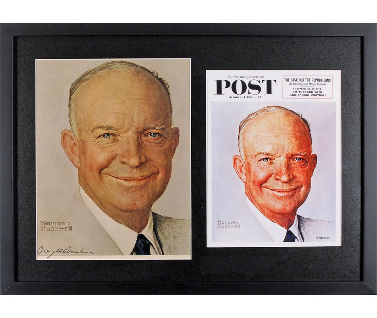 Color print of Norman Rockwell’s Saturday Evening Post cover image of Eisenhower, 8.75 x 11.5, signed in black ink by Eisenhower. Matted and framed with a reproduction of the cover to an overall size of 21.5 x 15.5. In fine condition. Accompanied by a full letter of authenticity from PSA/DNA.