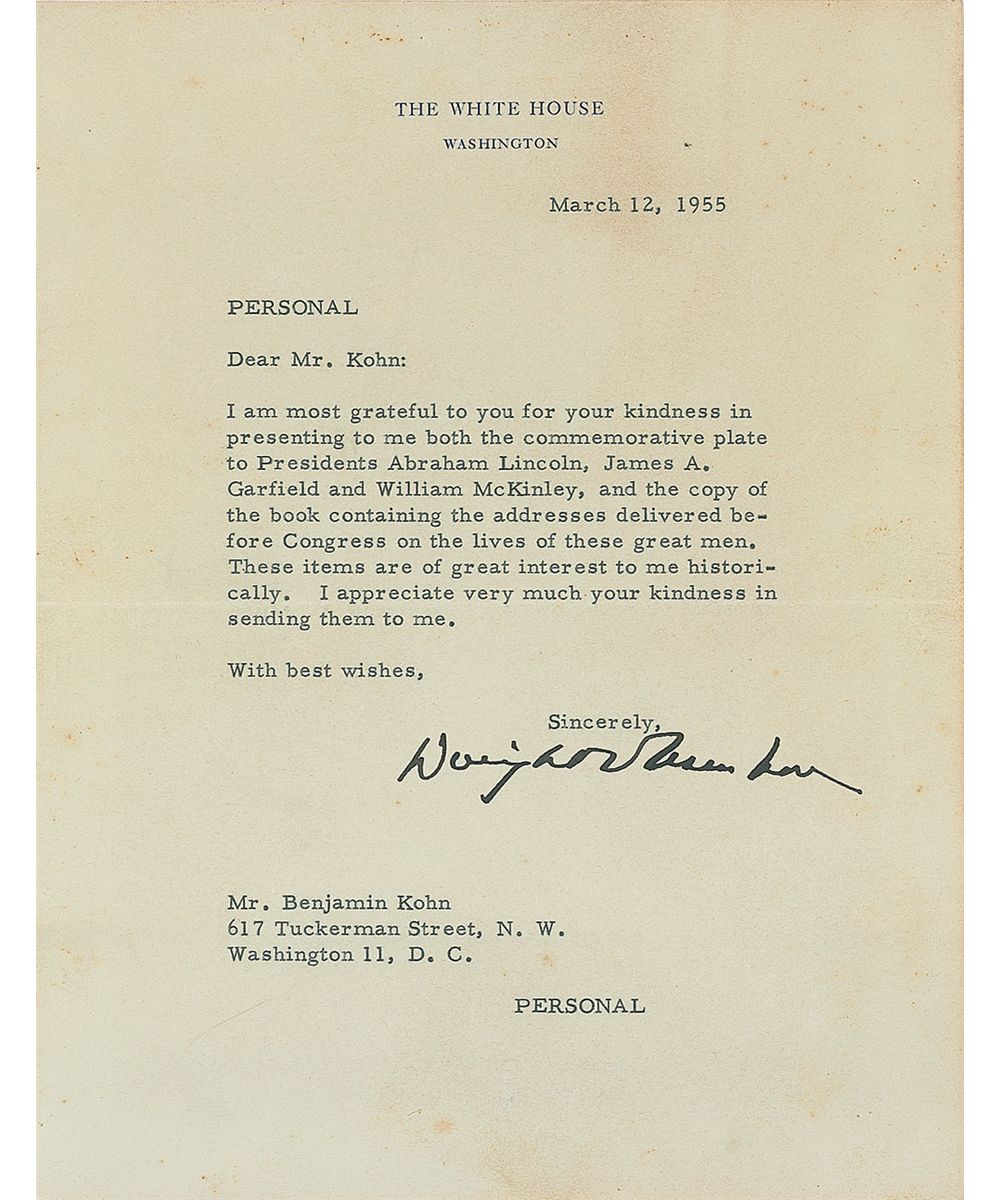 TLS as president, one page, 7 x 9, White House letterhead, March 12, 1955. Letter of thanks to Benjamin Kohn for a gift honoring the three assassinated presidents, in part: “I am most grateful to you for your kindness in presenting to me both the commemorative plate to Presidents Abraham Lincoln, James A. Garfield and William McKinley, and the copy of the book containing the addresses delivered before Congress on the lives of these great men. These items are of great interest to me historically.” In fine condition, with light scattered foxing. Letters from presidents pertaining to their forebears are of the utmost desirability.