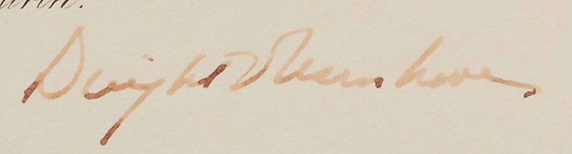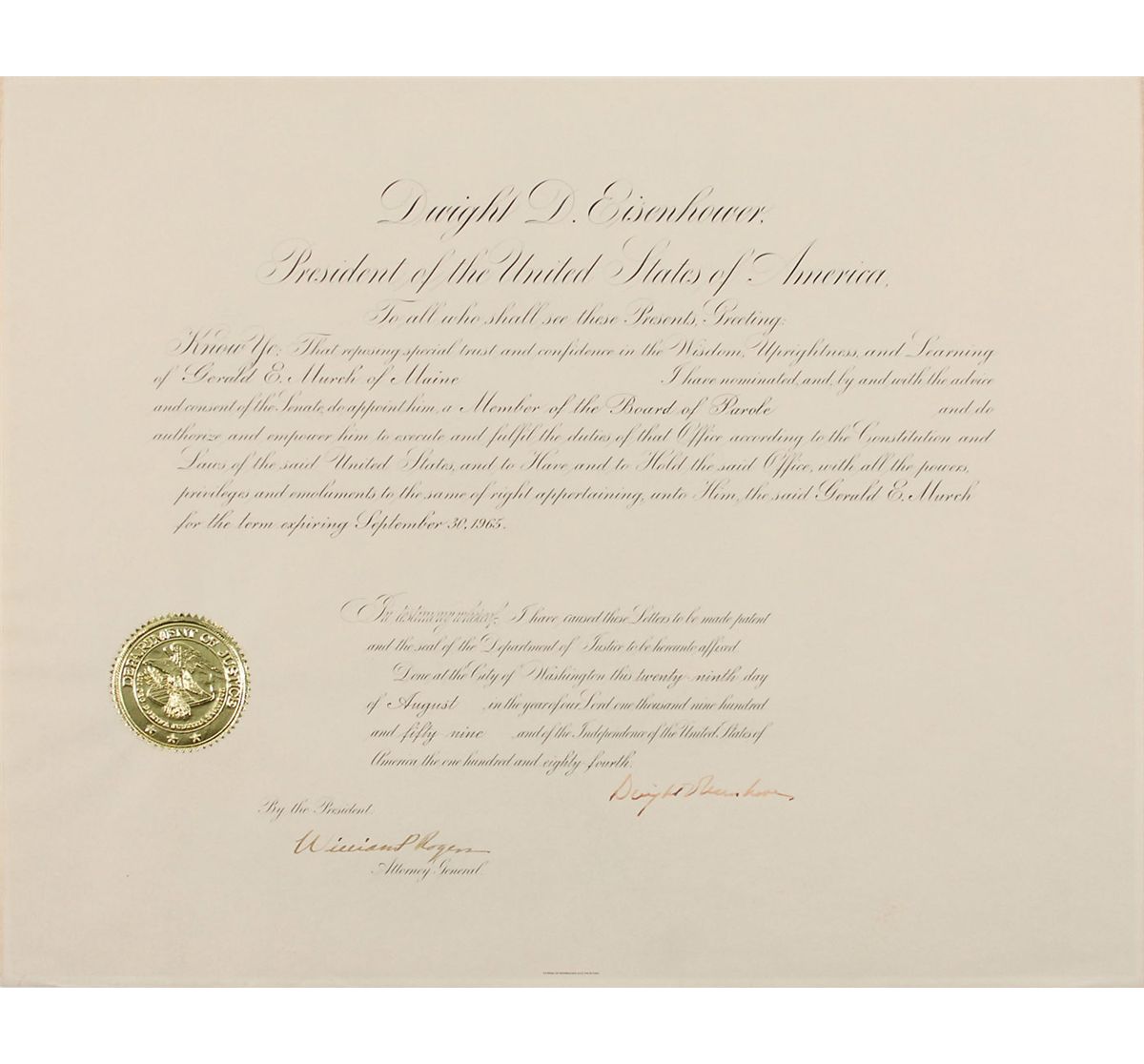 Partly-printed DS as president, one page, 20 x 16, August 29, 1959. President Eisenhower appoints “Gerald E. Murch of Maine,” to be “a Member of the Board of Parole.” Signed at the conclusion by Eisenhower and countersigned by Attorney General William P. Rogers. In fine condition, with a uniform shade of slight toning from previous display and Eisenhower’s signature just a shade light. The gold foil seal is crisp and intact. According to Eisenhower’s travel schedule, this particular document was signed while on a trip through Europe, which took him to Balmoral Castle to meet with Prime Minister Macmillian and Queen Elizabeth on August 28–29. Eisenhower presidential appointments are uncommon.