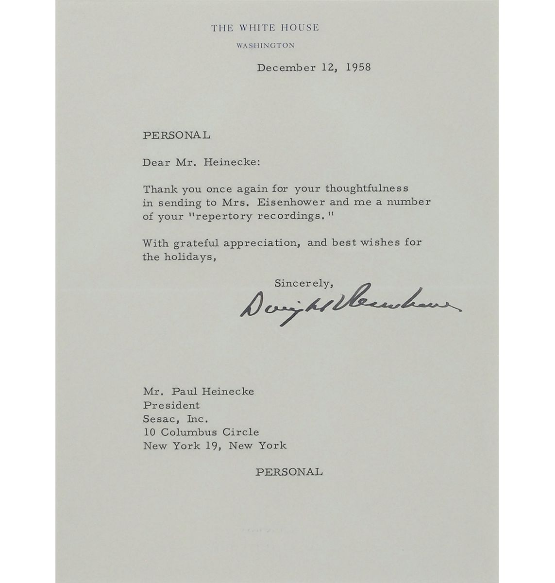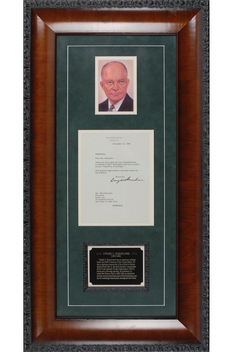 TLS as president, one page, 6.25 x 8, White House letterhead, December 12, 1958. Letter, marked “Personal” at the top, to Paul Heinecke, President of Sesac, Inc. In part: “Thank you once again for your thoughtfulness in sending Mrs. Eisenhower and me a number of your ‘repertory recordings.’” Double–suede–matted and framed with a portrait and a biographical plaque to an overall size of 17.25 x 32.5. In fine condition. Accompanied by a full letter of authenticity from PSA/DNA. Oversized.