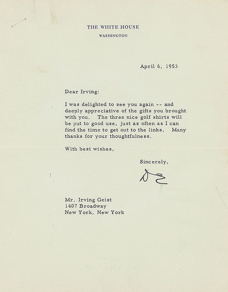 TLS as president signed “DE,” one page, 7 x 8.75, White House letterhead, April 6, 1953. Letter of thanks for a gift. In full: “I was delighted to see you again—and deeply appreciative of the gifts you brought with you. The three nice golf shirts will be put to good use, just as often as I can find the time to get out to the links. Many thanks for your thoughtfulness.” In fine condition, with staple hole and slight soiling to top left, and a trivial brush to second initial.