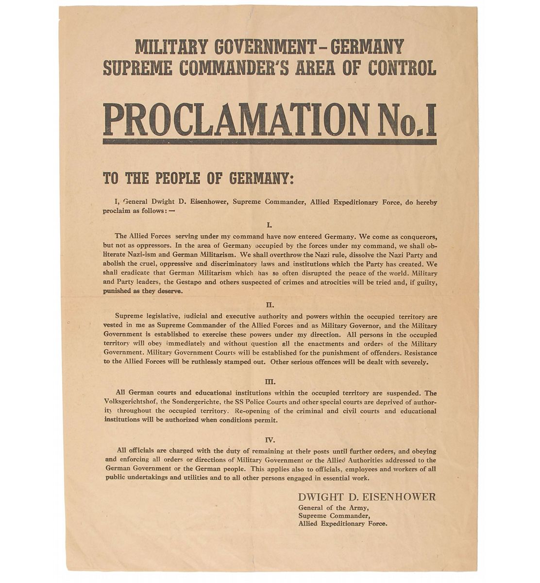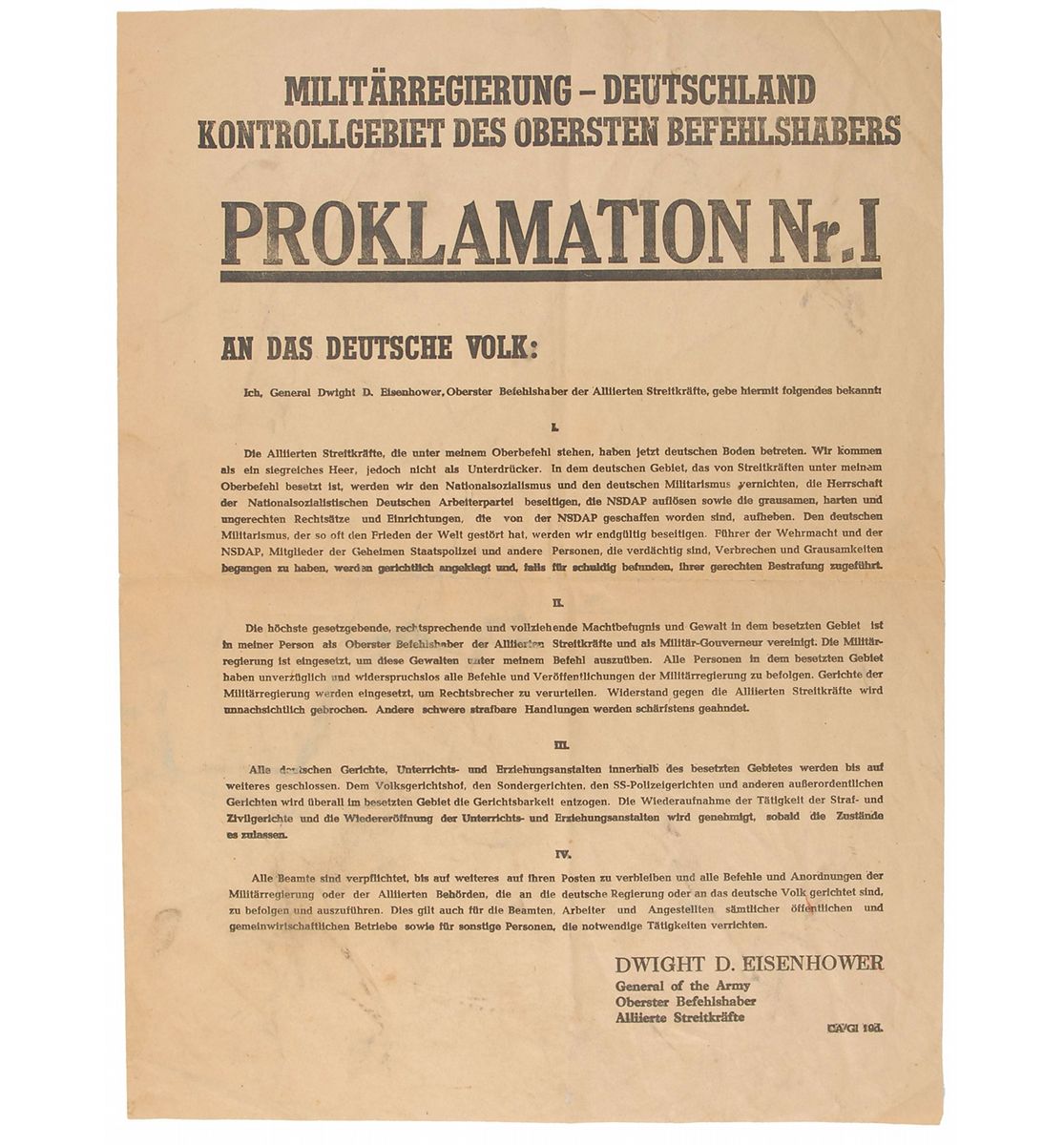 Scarce broadside in English and German, two adjoining 11.75 x 16.5 sheets, circa September 1944. Eisenhower’s proclamation to the people of Germany announcing the establishment of an Allied Military Government. In part: “I, General Dwight D. Eisenhower, Supreme Commander, Allied Expeditionary Force, do hereby proclaim as follows:—I. The Allied Forces serving under my command have now entered Germany. We come as conquerors, but not as oppressors. In the area of Germany occupied by the forces under my command, we shall obliterate Nazi-ism and German Militarism. We shall overthrow the Nazi rule, dissolve the Nazi Party and abolish the cruel, oppressive and discriminatory laws and institutions which the Party has created. We shall eradicate that German Militarism which has so often disrupted the peace of the world. Military and Party leaders, the Gestapo and others suspected of crimes and atrocities will be tried and, if guilty, punished as they deserve. II. Supreme legislative, judicial and executive authority and powers within the occupied territory are vested in me as Supreme Commander of the Allied Forces and as Military Governor.” Central vertical and horizontal folds (partial separations repaired to reverse) and overall wrinkling, otherwise fine condition. The United Press reported from Allied Supreme Headquarters in London on September 18, 1944, that ‘a broadcast message directed to Western and Southwestern Germany said that Eisenhower will exercise supreme legislative, judicial and executive authority in the theater under his command.’