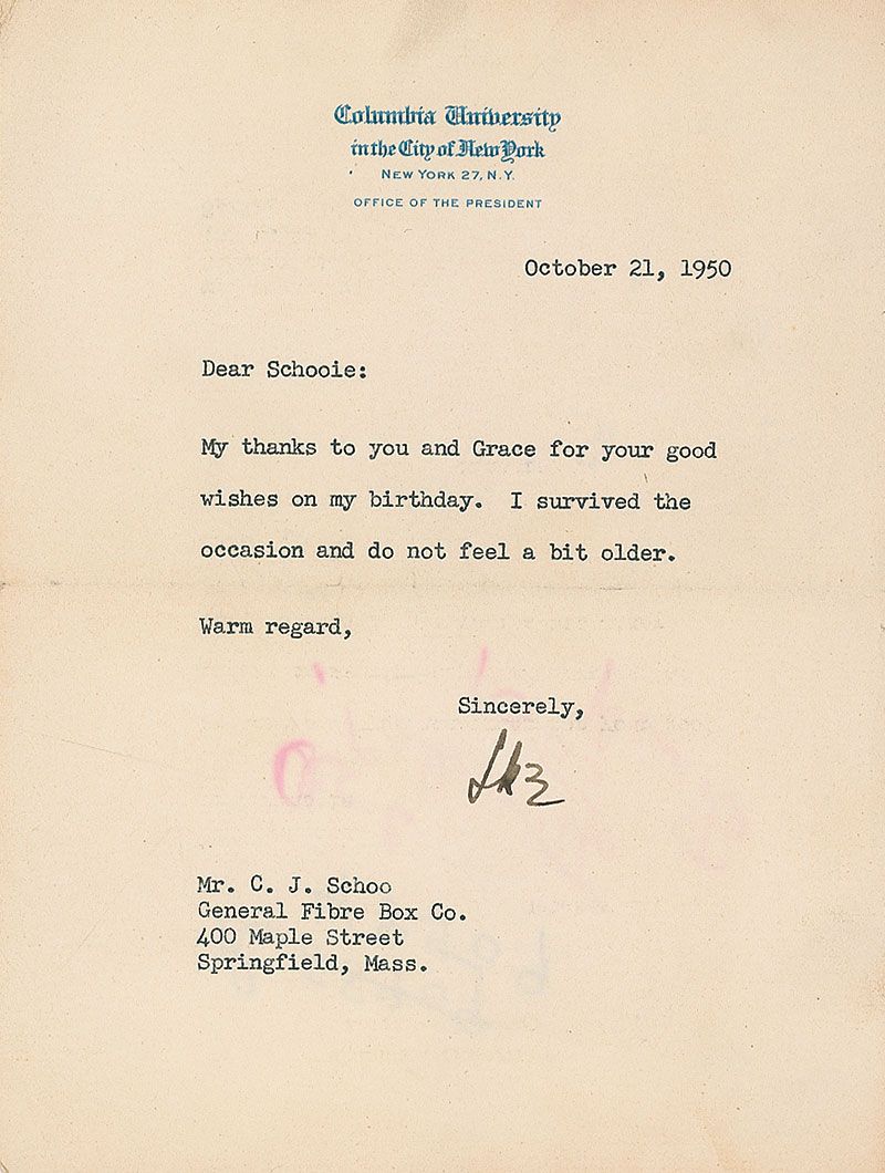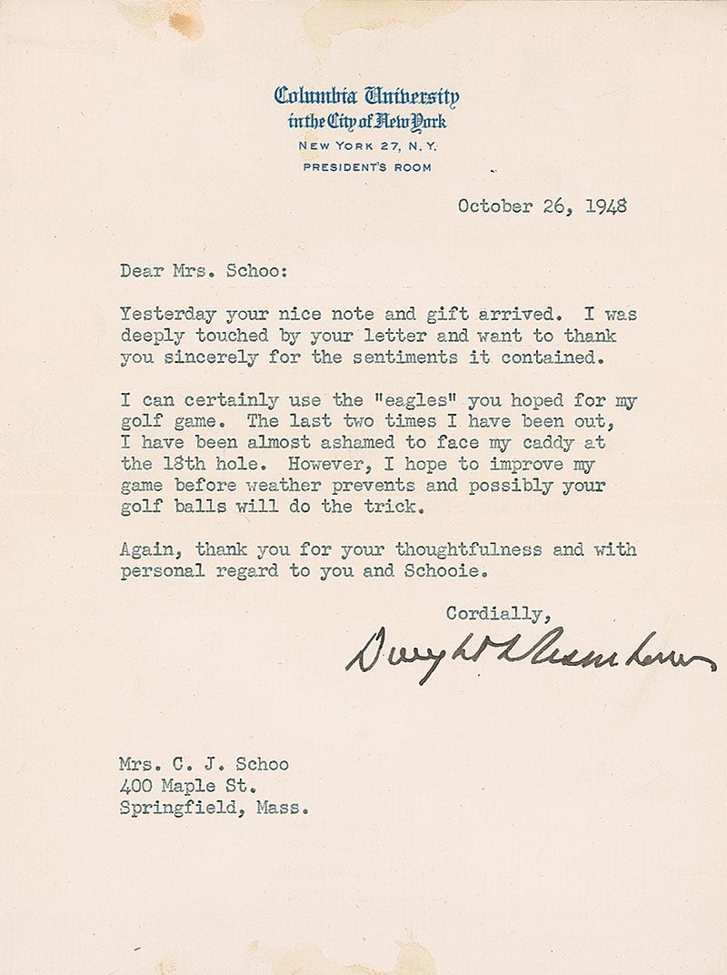 Three TLSs, signed “Ike Eisenhower,” “Dwight D. Eisenhower,” and “Ike,” each one page, Columbia University letterhead, dated between 1948 and 1950. One letter, in part: “I can certainly use the ‘eagles’ you hoped for my golf game. The last two times I have been out, I have been almost ashamed to face my caddy at the 18th hole. However, I hope to improve my game before weather prevents and possibly you golf balls will do the trick.” In overall fine condition, with some scattered light staining. Accompanied by one original mailing envelope.