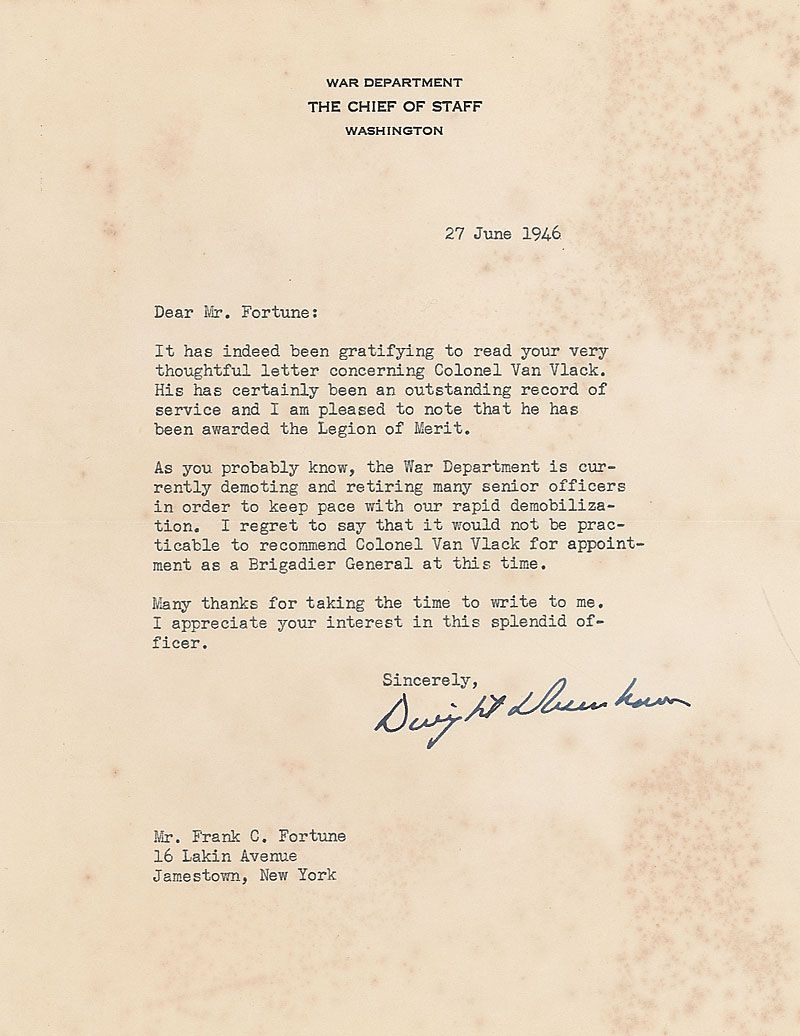 TLS, one page, 7 x 9, War Department, Chief of Staff letterhead, June 27, 1946. Letter to Frank Fortune. In part: “It is indeed gratifying to read your very thoughtful letter concerning Colonel Van Vlack…As you probably know, the War Department is currently demoting and retiring many senior officers in order to keep pace with our rapid demobilization. I regret to say that it would not be practicable to recommend Colonel Van Vlack for appointment as a Brigadier General at this time.” Accompanied by an unsigned carbon of Fortune’s letter to Eisenhower recommending Van Vlack for a promotion. Scattered foxing to corners and edges, otherwise fine condition.