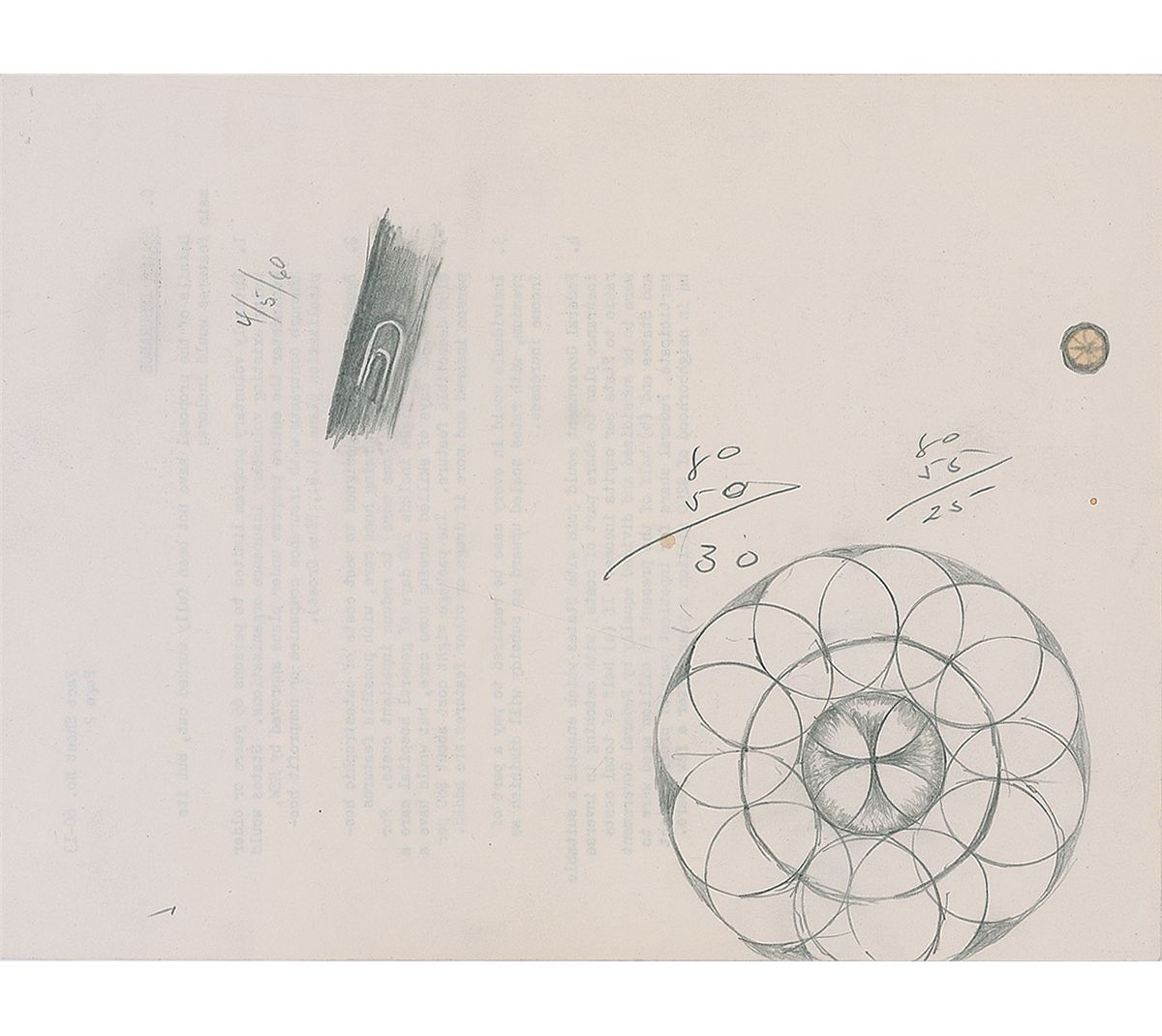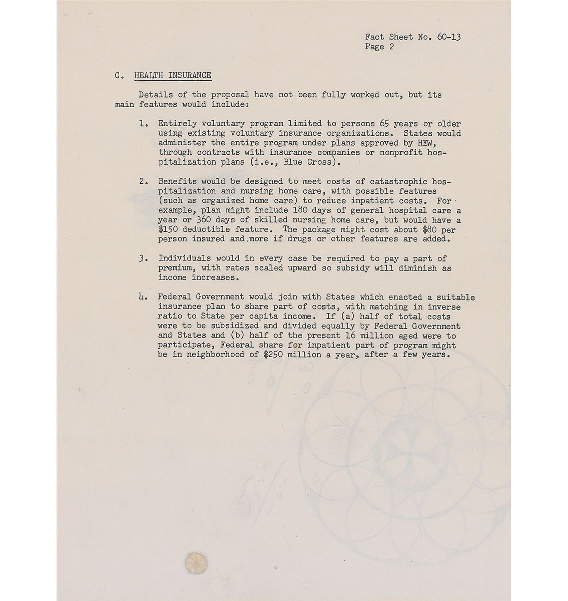 Original vintage unsigned pencil sketch of a paperclip, a circular geometric pattern, and two mathematical equations, dated, “4/5/60,” on the reverse of an off-white 8 x 10.5 sheet which is the second page second page of Fact sheet No. 60-13, a typed memo outlining a proposed national health insurance program, which soon would be known as the Medical Assistance for the Aged. In fine condition. Eisenhower was an accomplished artist and was known to sketch during meetings.