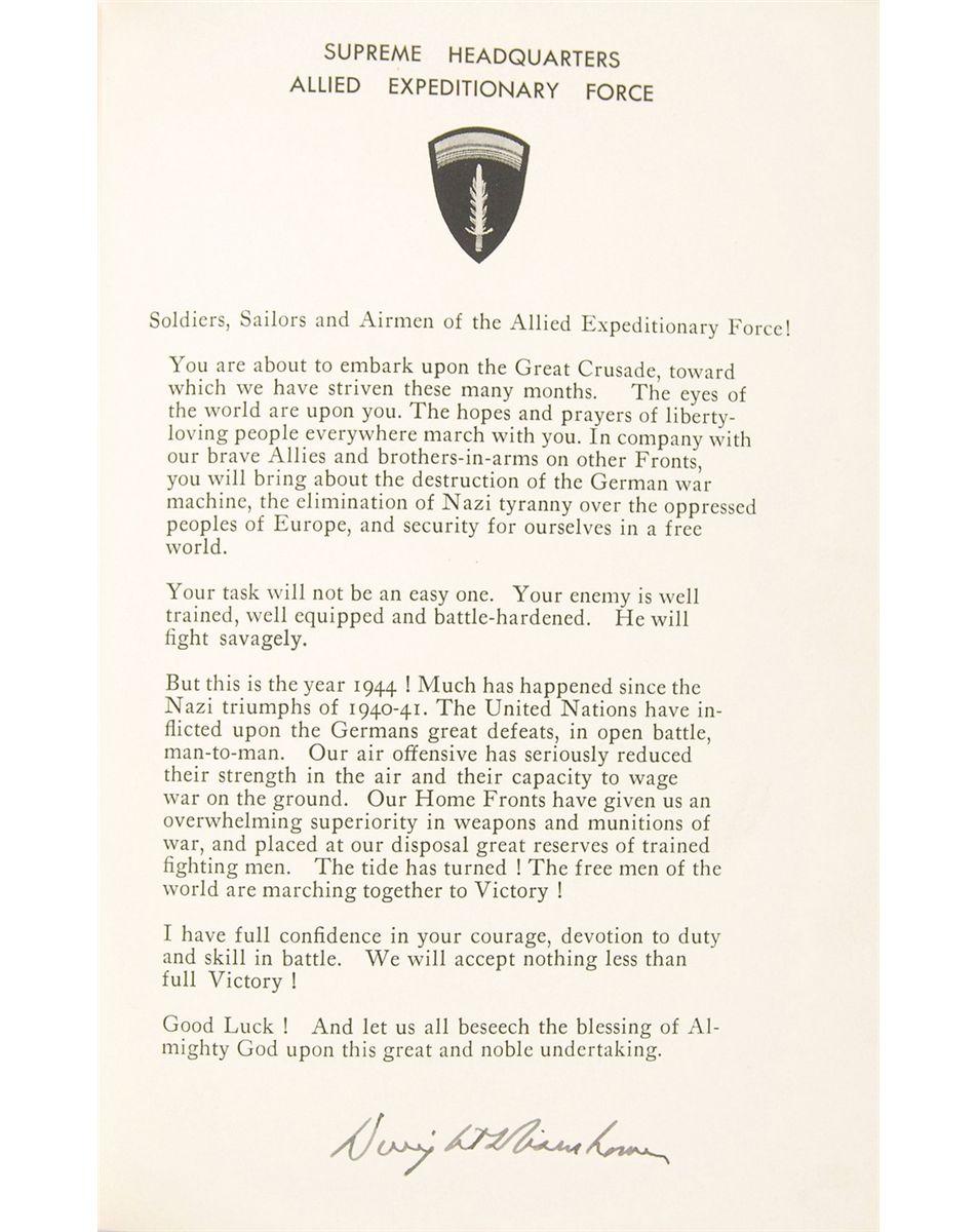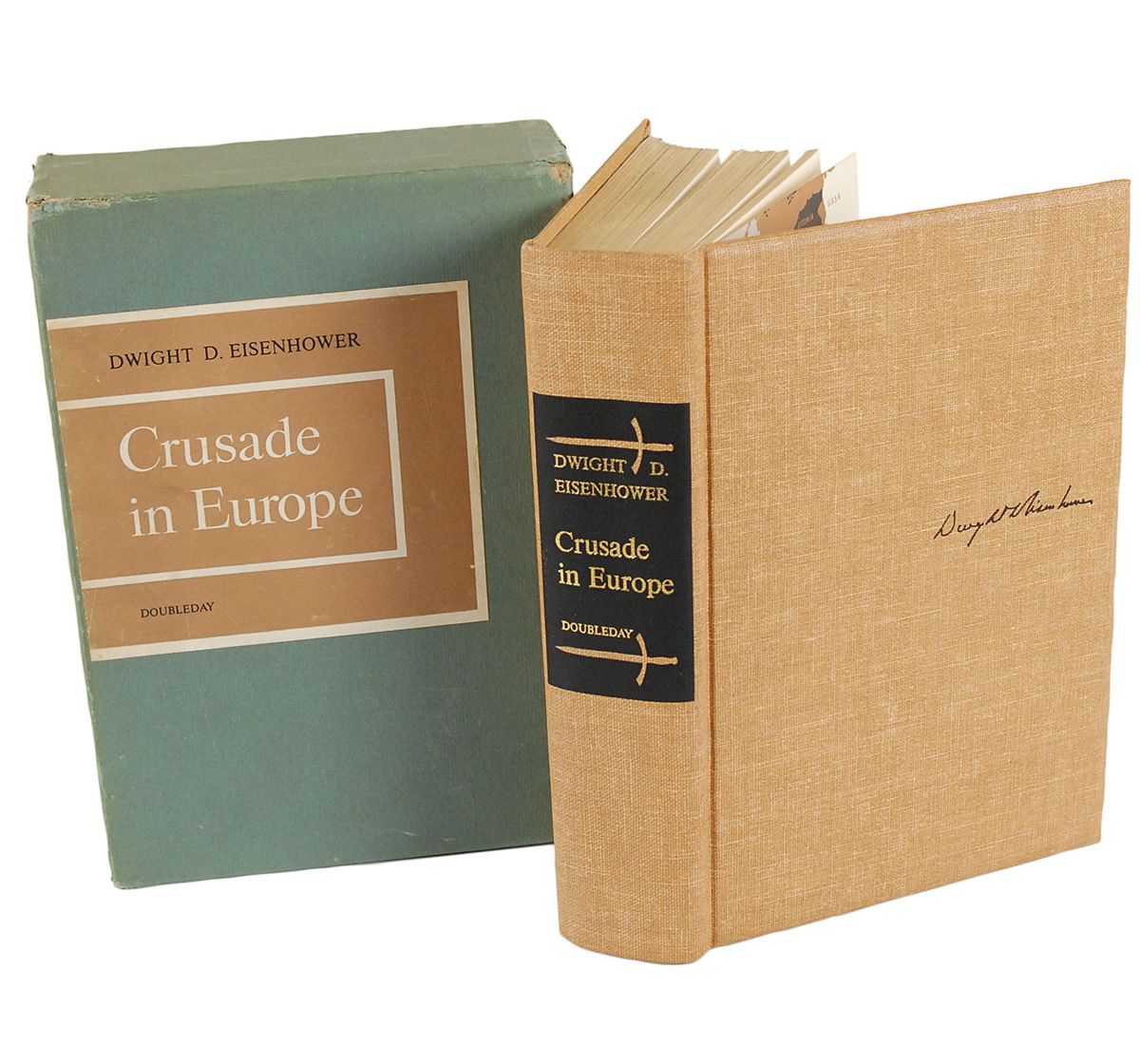 Signed book: Crusade in Europe. First edition, limited issue of 1426 copies (this being No. 961). NY: Doubleday, 1948. Hardcover with slipcase, 6.75 x 9.75, 559 pages. Signed in fountain pen on a special prefatory page reproducing Eisenhower’s Order of the Day on D-Day, “Dwight D. Eisenhower.” Autographic condition: very fine. Book condition: F/None, in VG- original slipcase.