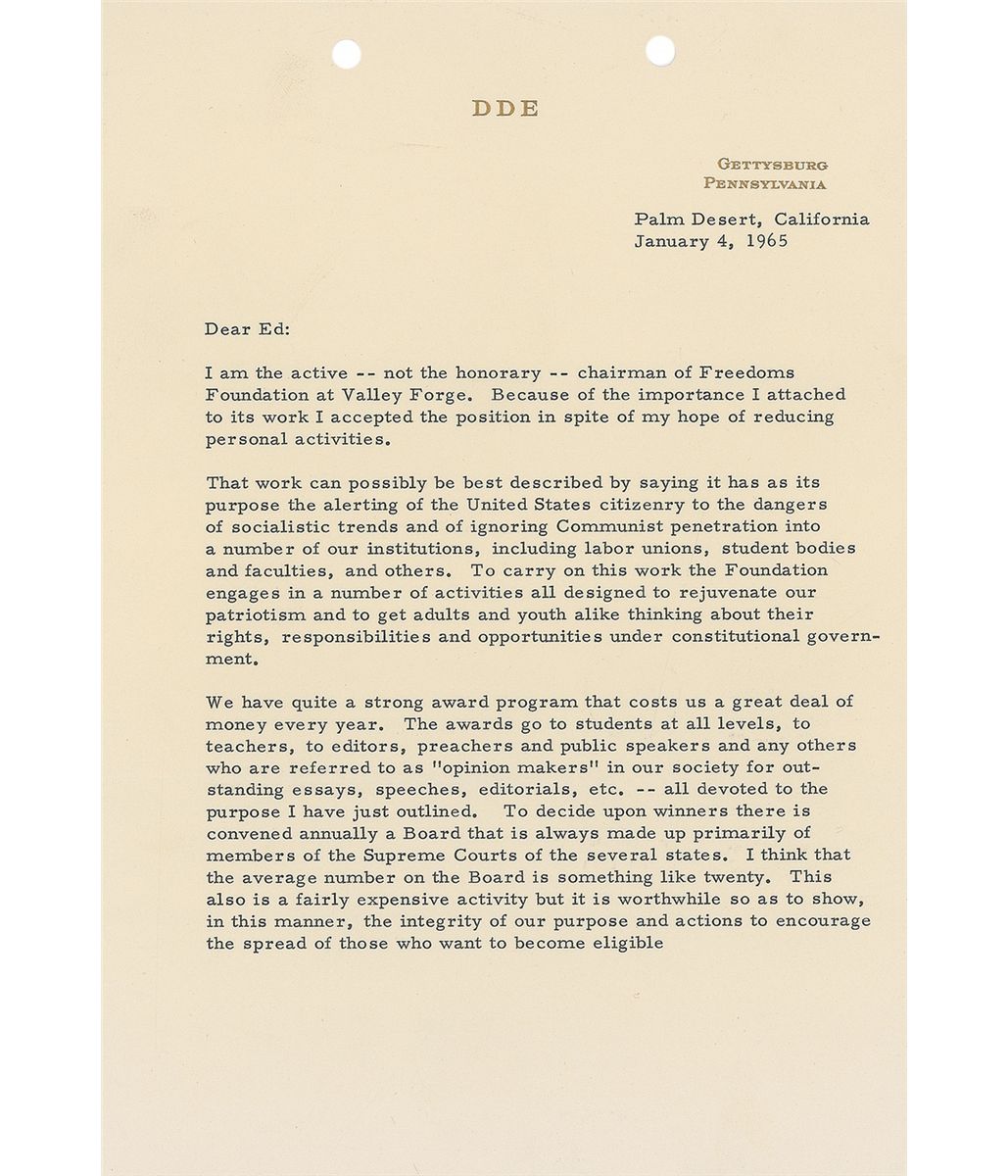 TLS signed “Ike,” two pages, 7 x .25, personal letterhead, January 4, 1965. Letter to his older brother Edgar N. Eisenhower. In part: “I am the active—not the honorary—chairman of Freedoms Foundation at Valley Forge…It has as its purpose the alerting of the United States citizenry to the dangers of socialistic trends and of ignoring Communist penetration into a number of our institutions, including labor unions, student bodies and faculties, and others…We believe that trends to socialism and communism will be halted better by positive thinking and by an alert citizenry rather than merely hunting out laboriously the offender who is occasionally hauled before the courts.” In fine condition, with filing holes to the top. Much of Eisenhower’s term as president was characterized by America’s fear of communism; the early 1950s saw the second ‘Red Scare’ and rise of McCarthyism, and Eisenhower promoted military intervention in Korea to halt the spread of communism in Asia. An exceptional, historically relevant letter concerning one of Ike’s most closely held political opinions.