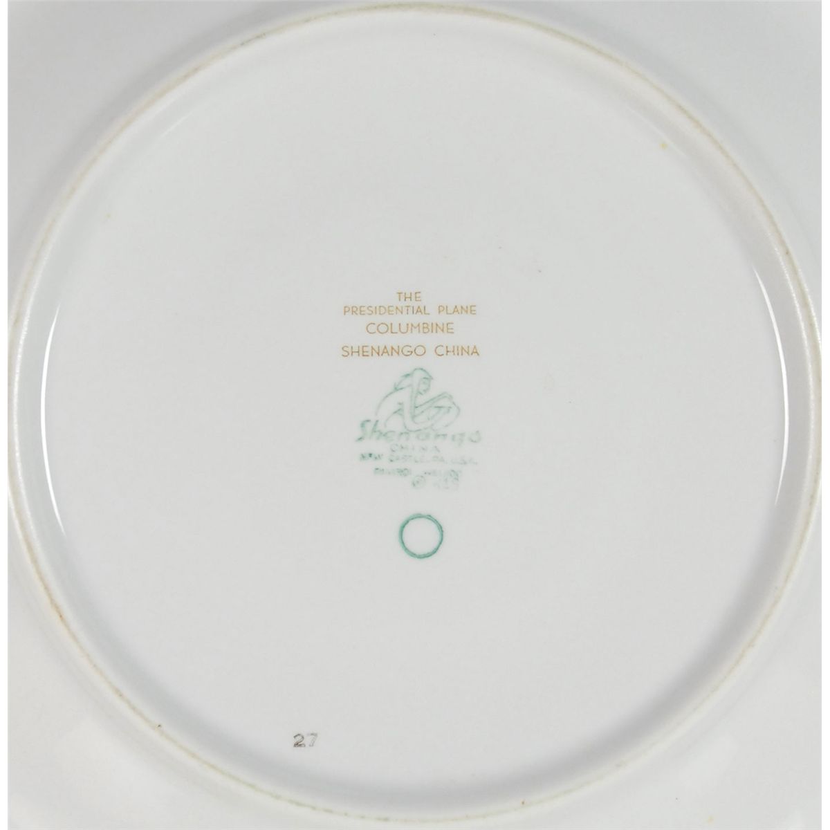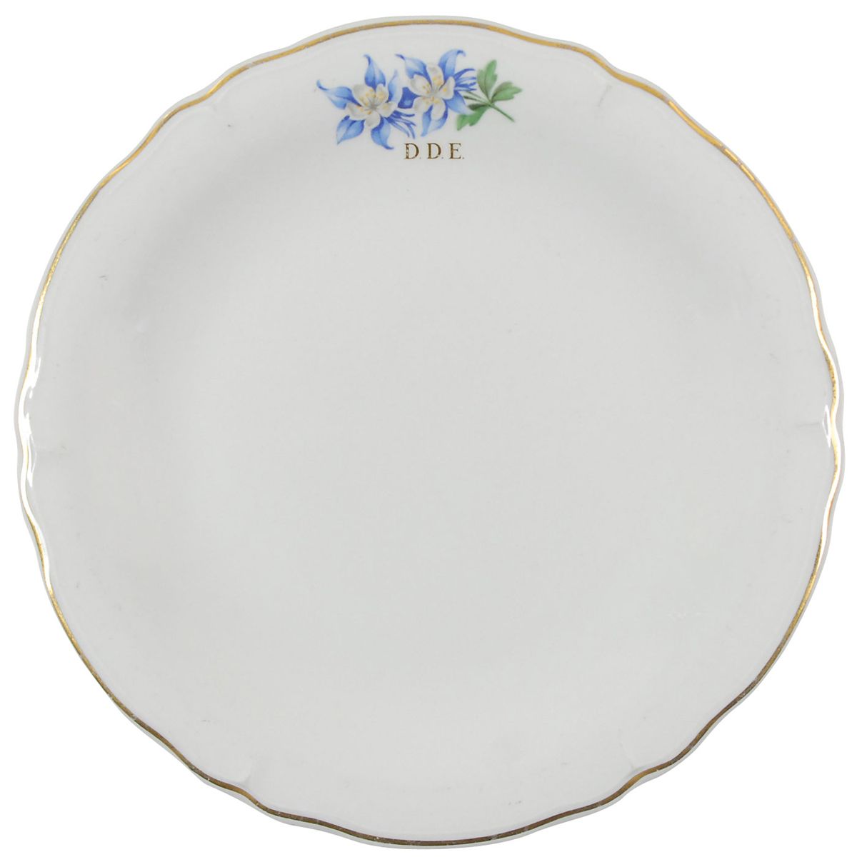 White China dinner plate, 10? diameter, made for President Eisenhower’s presidential jet, Columbine. The dinner plate features a border in gilt, with the blue columbine flower at one edge and a gilt-lettered “D.D.E.” beneath the flower. The plate’s underside is gilt-lettered “The Presidential Plane Columbine,” and is stamped with the company’s logo and “Shenango, China New Castle, Pa., U.S.A., Rimrol Welroc K18.” In fine condition, with expected light surface wear from use. Plate originates from the collection of presidential historian and collector Gerald Gurian.