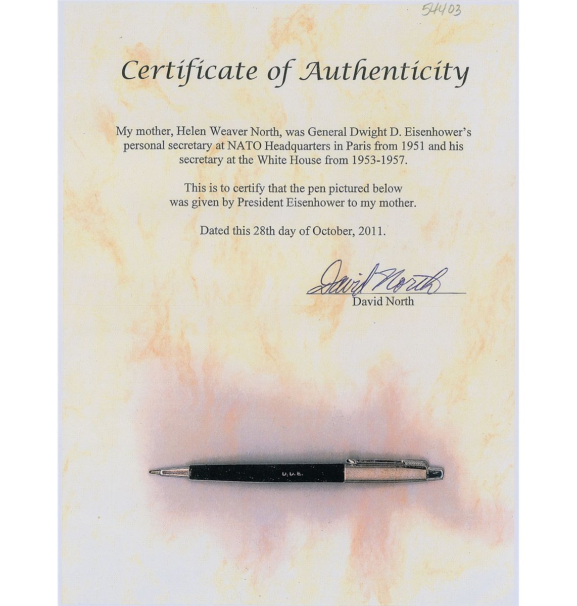 Eisenhower’s personally owned Parker ‘Liquid Lead’ pen, measuring 5.25? long, with his initials, “D. D. E.,” engraved on the black barrel. In fine condition, with rubbing to the barrel and top of the initials. Accompanied by a certificate of authenticity from David North which states: “My mother, Helen Weaver North, was General Dwight D. Eisenhower’s personal secretary at NATO Headquarters in Paris from 1951 and his secretary at the White House from 1953-1957. This is to certify that the pen pictured below was given by President Eisenhower to my mother.”