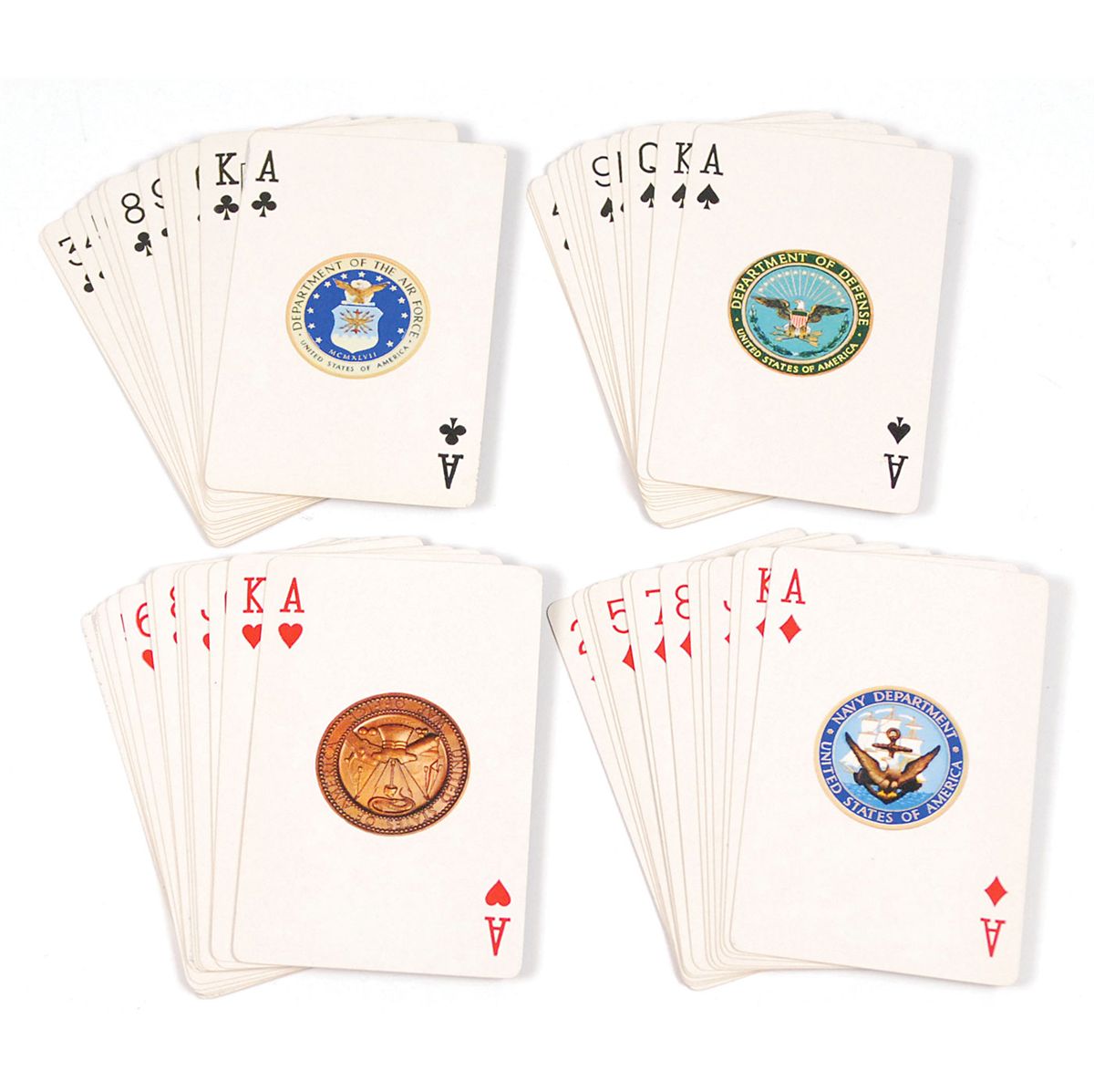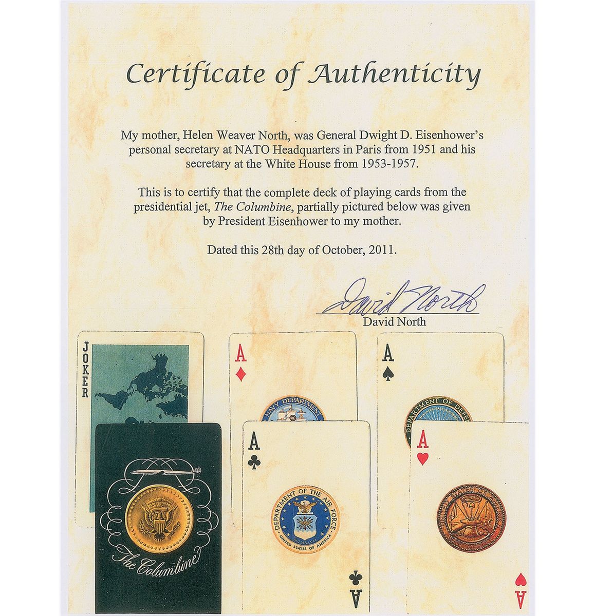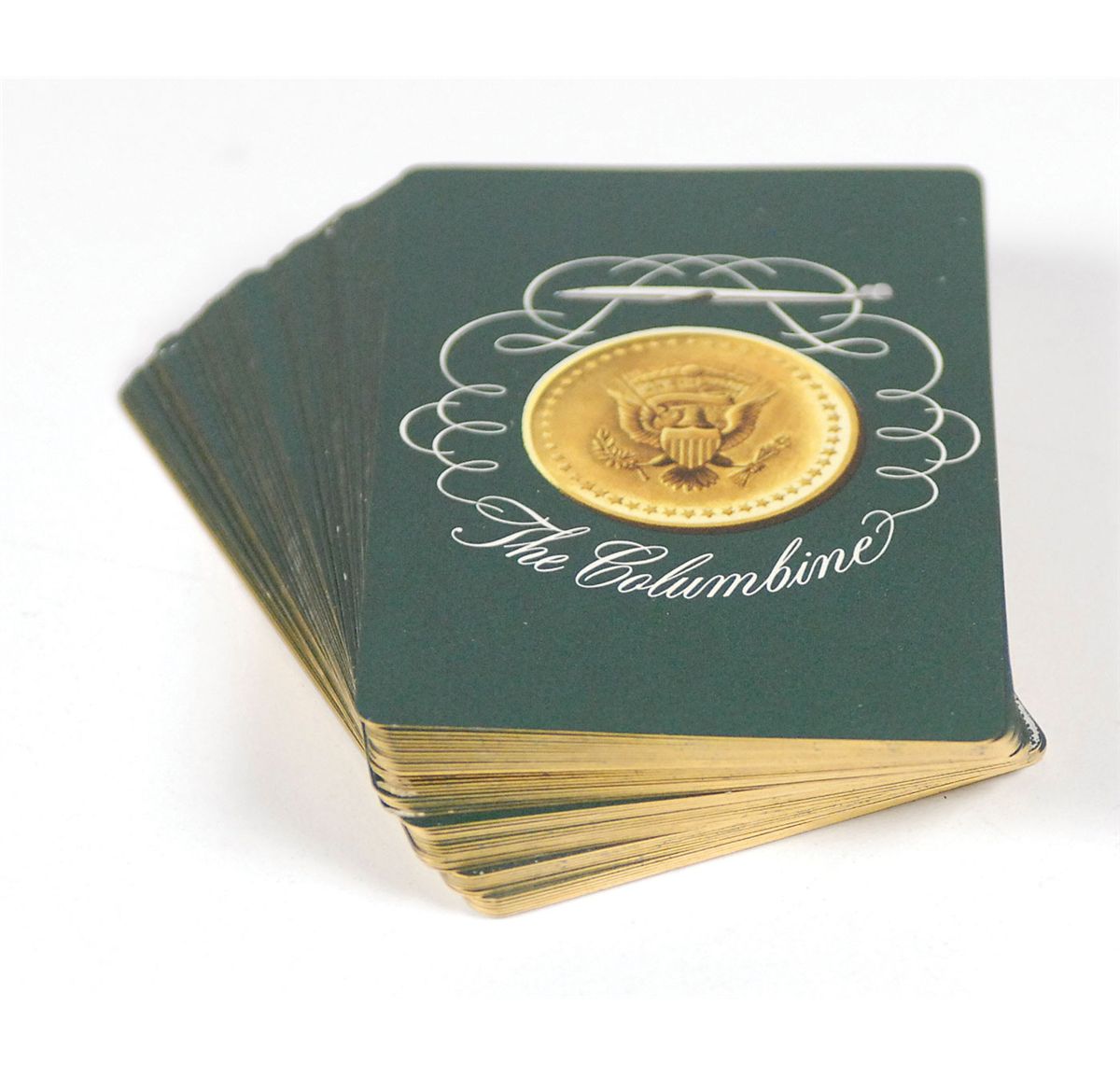 Complete set of 54 gilt-edged playing cards, including the standard 52 cards plus two jokers, with a design featuring the presidential seal and image of the presidential jet, and the name “The Columbine” in white script below. In fine condition. Accompanied by a certificate of authenticity signed by David North, in part: “My mother, Helen Weaver North, was General Dwight D. Eisenhower’s personal secretary at NATO Headquarters in Paris from 1951 and his secretary at the White House from 1953–1957. This is to certify that the complete deck of playing cards from the presidential jet, The Columbine…was given by President Eisenhower to my mother.”