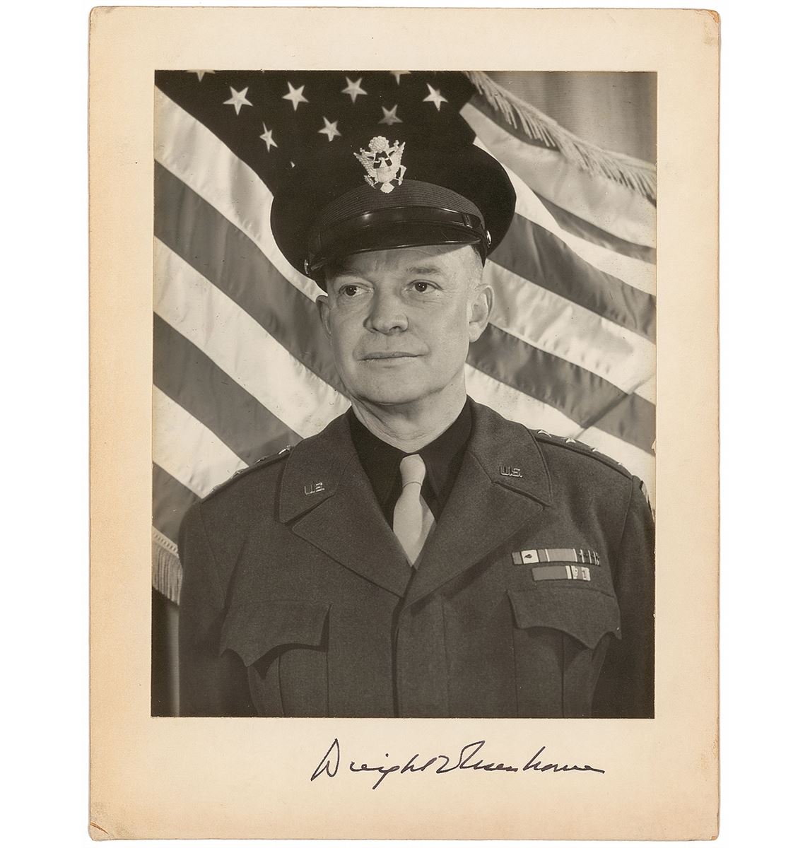 Patriotic matte-finish 7.25 x 9.5 portrait of Eisenhower in uniform against an American flag background, affixed to a 9 x 12 mount, signed on the mount in fountain pen. Dings and small chips to corners and edges of the mount, and corners of the photo peeling from the mount, otherwise fine condition.