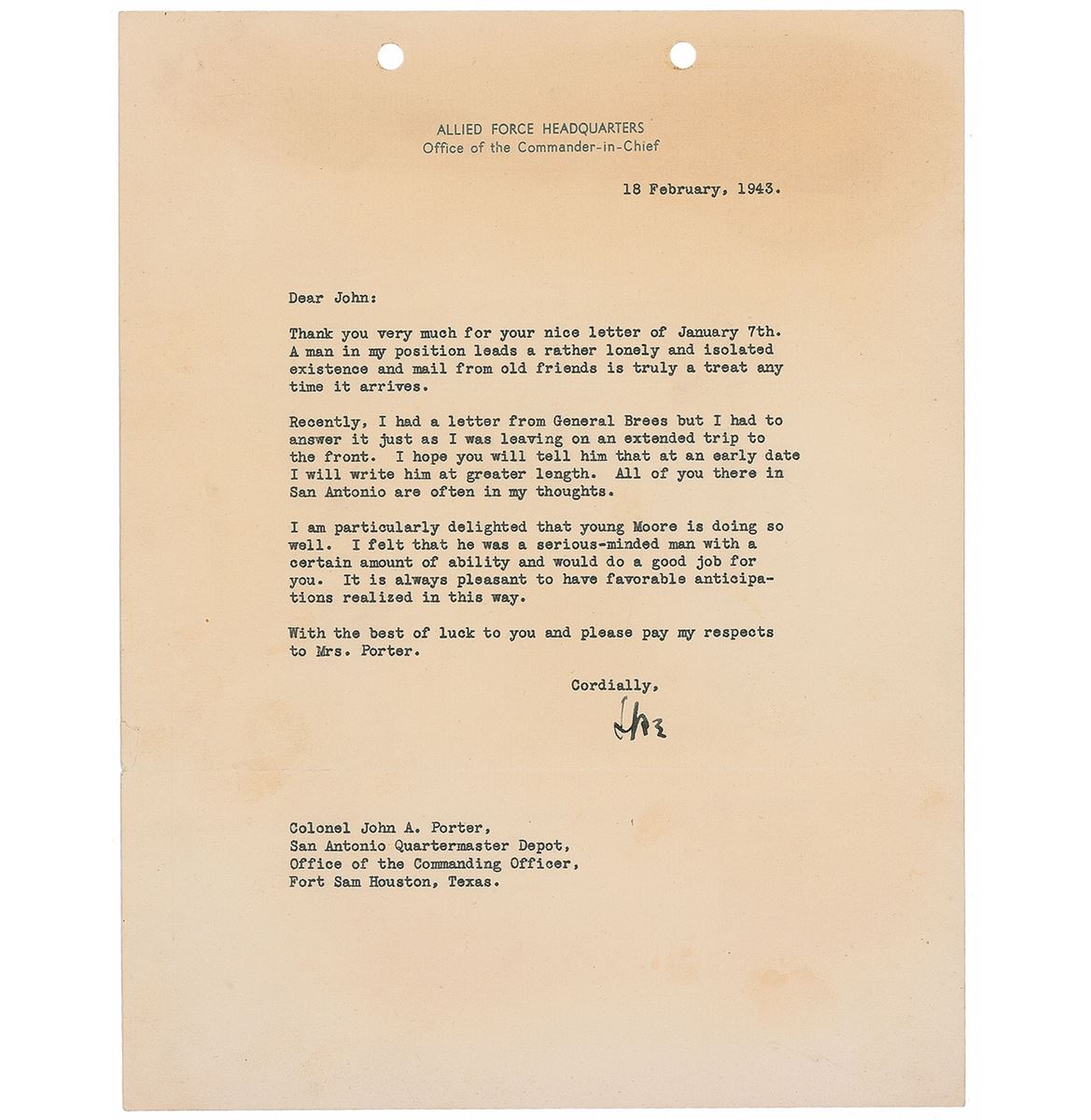 TLS signed “Ike,” one page, 8 x 10.25, Office of the Commander–in–Chief letterhead, February 18, 1943. Letter to John Porter, in part: “Thank you very much for your nice letter of January 7th. A man in my position leads a rather lonely and isolated existence and mail from old friends is truly a treat any time it arrives. Recently, I had a letter from General Brees but I had to answer it just as I was leaving on an extended trip to the front…All of you there in San Antonio are often in my thoughts.” In fine condition, with a small tear to left edge, slight scattered toning, and a pair of punch holes to upper edge.