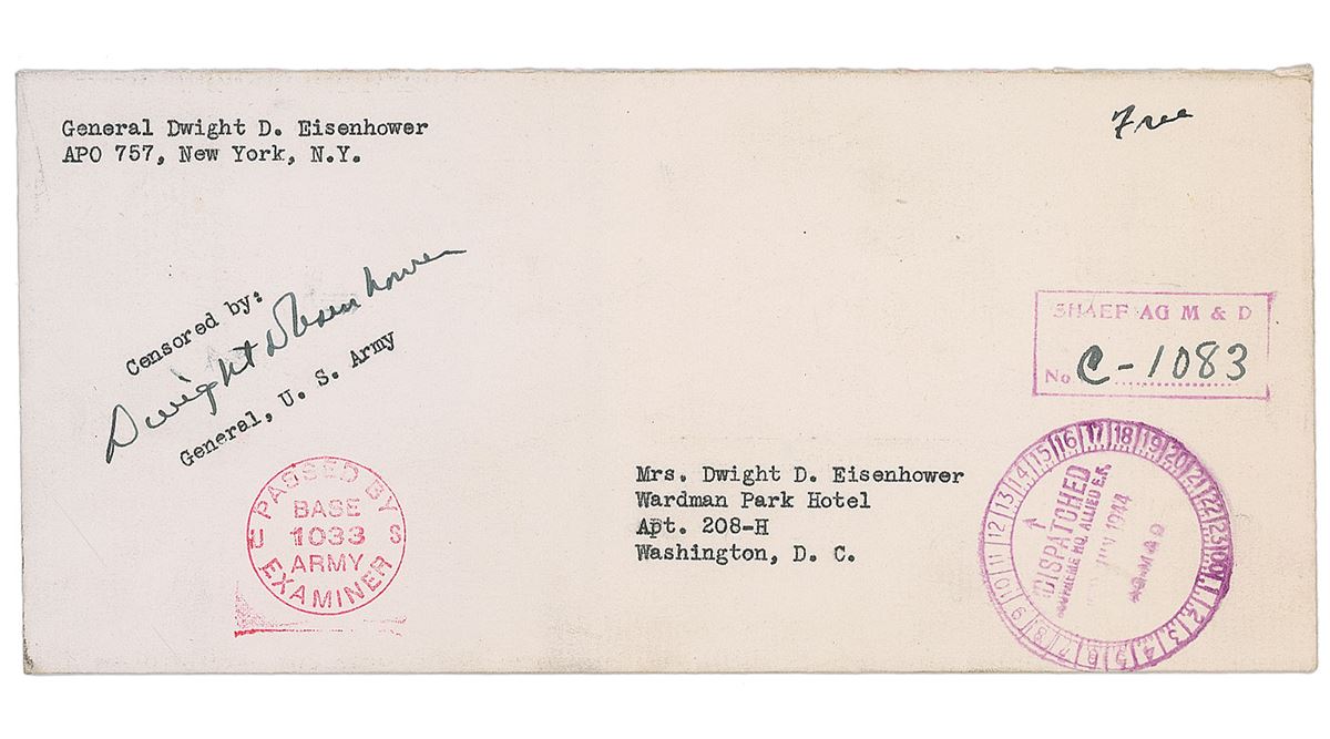Official Supreme Headquarters, Allied Expeditionary Force mailing envelope, 8.25 x 3.75, addressed in type to his wife at the Wardman Park Hotel in Washington, signed on the left side in fountain pen with a censorship signature, “Dwight D. Eisenhower.” The envelope is postmarked June 1944, bears several military base ink stamps, and a ‘Free’ notation to the upper left. In fine condition. Accompanied by a printed ‘Safe Conduct’ pass in German and English bearing two pre-printed facsimile signatures of Eisenhower, stating that if a German soldier is carrying the pass it signifies his intent to surrender.