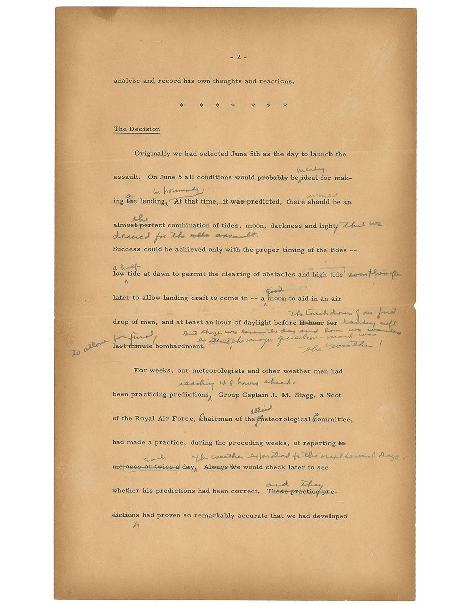 Page from a typed manuscript draft copiously revised in pencil by Eisenhower, unsigned, one page, 8.5 x 14, no date but circa 1964. Part of a draft for an article published in Paris Match in honor of the 20th anniversary of D-Day, explaining the grounds for the last-minute postponement of the landings. In part (as corrected): “Originally we had selected June 5th as the day to launch the assault…Success could be achieved only with the proper timing of the tides—a half-tide at dawn to permit the clearing of obstacles and high tide soon thereafter to allow landing craft to come in—a good moon to aid in an air drop of men, and at least half an hour of daylight before the touchdown of our first landing craft to allow for final bombardment.” Nearly every line has multiple corrections in Eisenhower’s hand, most making significant corrections, emendations, and additions. In very good condition, with heavy toning to borders and a small stain to the top edge.