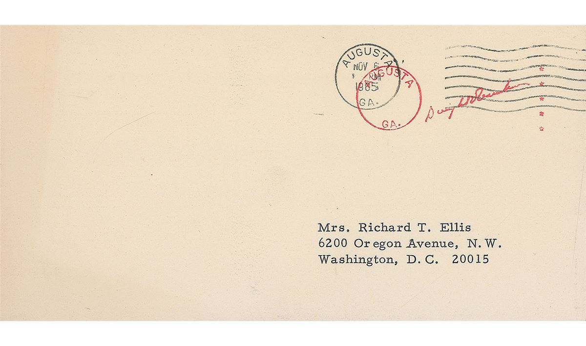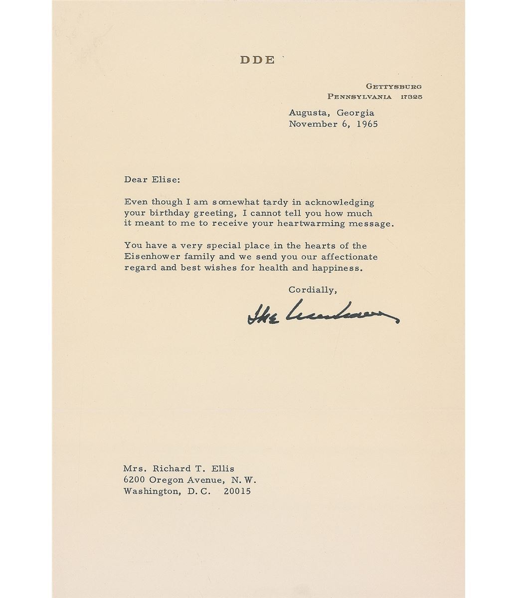 TLS signed “Ike Eisenhower,” one page, 7 x .25, personal letterhead, November 6, 1965. Letter to Elise Ellis. In part: “Even though I am somewhat tardy in acknowledging your birthday greeting, I cannot tell you how much it meant to me to receive your heartwarming message. You have a very special place in the hearts of the Eisenhower family.” In fine condition. Accompanied by the original mailing envelope. Originally purchased from Walter R. Benjamin Autographs and accompanied by the original paper folder.