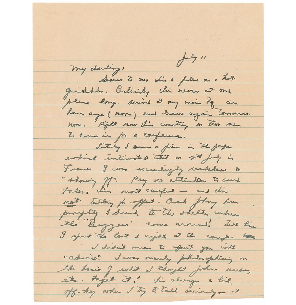 On July 4, 1944, Eisenhower left his headquarters in Portsmouth to visit Allied positions in Normandy with General Omar Bradley; during his trip, he took what was supposed to be a quiet flight aboard a P-47 to get a better view of the battlefields. When he returned to the airstrip, he found himself surrounded by Signal Corps photographers and the story quickly made it to the press. Much to Eisenhower's chagrin, the flight was characterized as a reckless stunt; even his personal aide, Sgt. Mickey McKeogh, described it as ‘one of the few unnecessary chances I ever saw him take.’ A superb wartime letter revealing a cross-section of Ike as both a courageous soldier and warm husband.