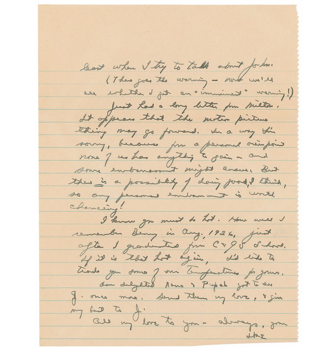 War-dated ALS signed “Ike,” two pages, lightly-lined, 8 x 10.5, July 11, 1944. Letter home to his wife, Mamie, in part: "Lately I saw a piece in the paper which intimated that on 4th July in France I was exceedingly reckless & 'showing off.' Pay no attention to such tales. I'm most careful—and I'm not talking for effect. Ask Johnny [Eisenhower] how promptly I duck to the shelter when the 'Buzzers' come around! Tell him I spent the last 2 nights at the camp. I didn't mean to upset you with 'advice.' I was merely philosophizing on the basis of what I thought John needs, etc. Forget it! I'm always a bit off key when I try to talk seriously—at least when I try to talk about John. (There goes the warning—now we'll see whether I get an 'imminent' warning!) Just had a long letter from Milton. It appears that the motion picture thing may go forward. In a way I'm sorry, because from a personal viewpoint none of us has anything to gain—and some embarrassment might ensue. But there is a possibility of doing good, I think, so any personal embarrassment is worth chancing!” In fine condition.