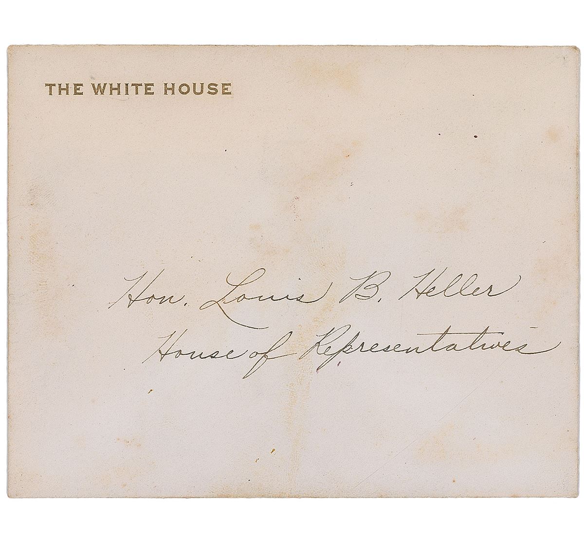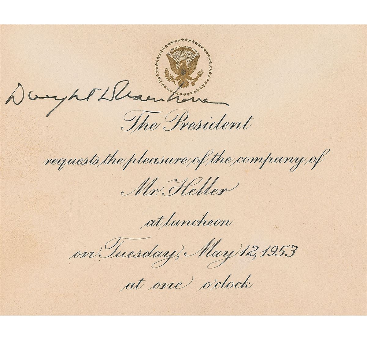 Official engraved White House invitation card for a luncheon on May 12, 1953, one page, 5 x 4, signed at the top in fountain pen as president, “Dwight D. Eisenhower.” The invitation is filled out in another hand for “Mr. Heller,” the Democratic Congressman Louis B. Heller. Light overall toning and a toned tape remnant to reverse, otherwise fine condition. Accompanied by the original transmittal envelope. This luncheon marked the last of a series of twenty-five that the newly inaugurated Eisenhower held so that he could meet the members of Congress on an ‘informal basis.’