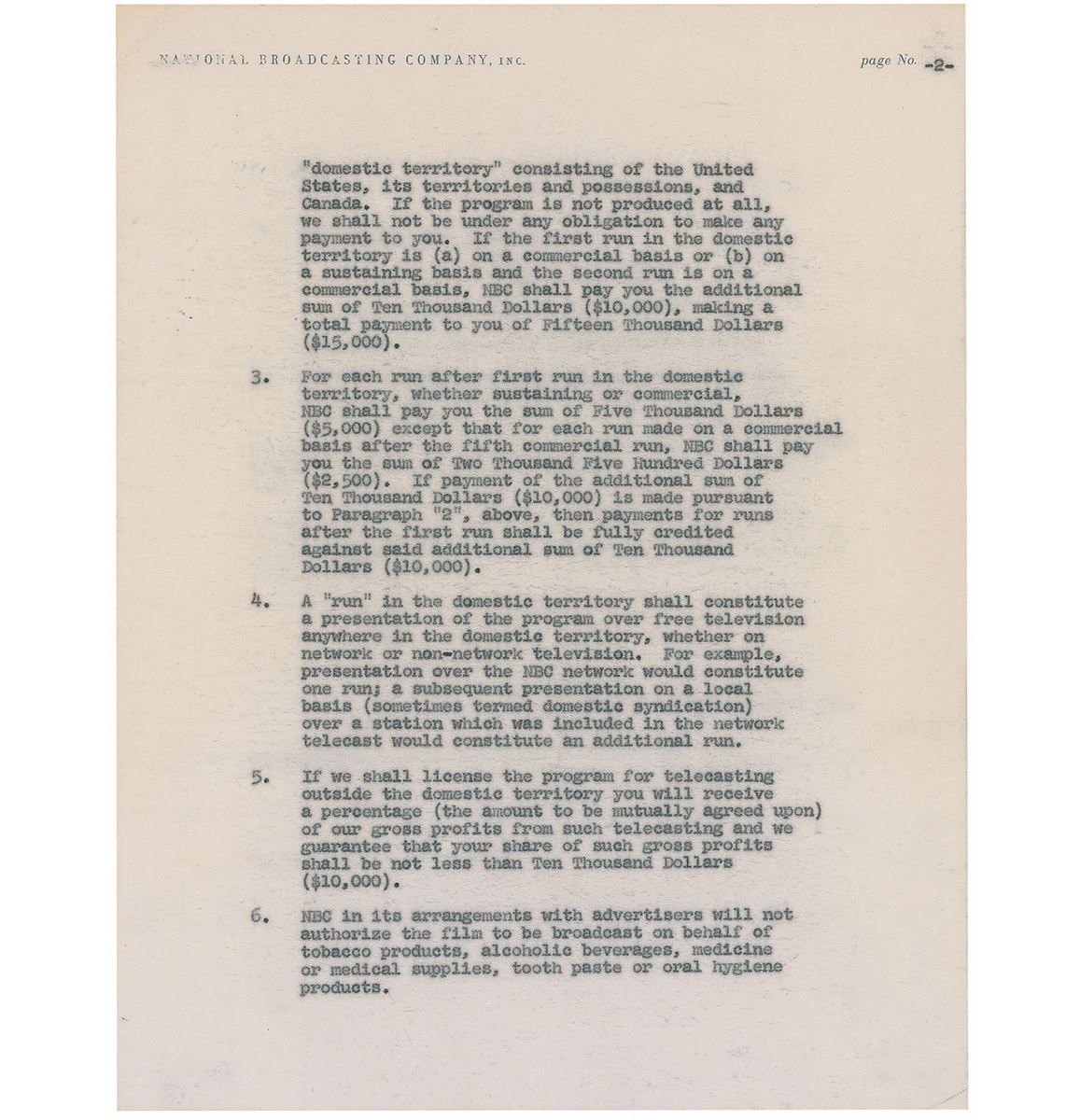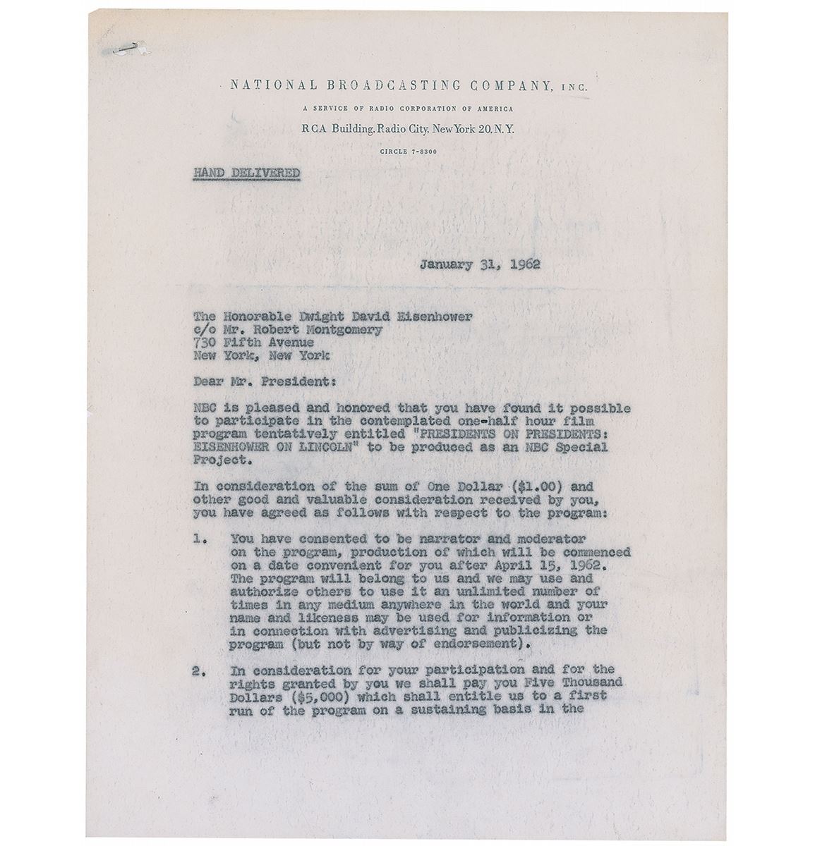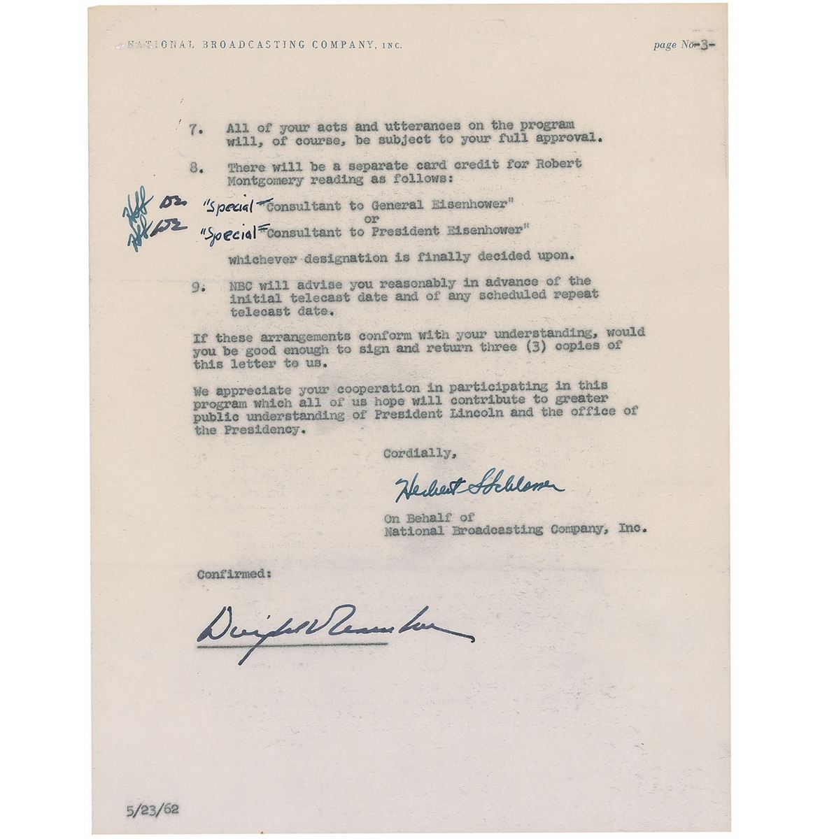 DS, three pages, 8.5 x 11, January 31, 1962. Agreement between Eisenhower and NBC for the former president to narrate a half-hour program entitled “Presidents on Presidents: Eisenhower on Lincoln,” with Eisenhower receiving $5,000 for his work, as well as additional payments for reruns and foreign distribution. Signed on the final page by Eisenhower, who also initials the last page twice. In fine condition, with expected light document wear.
