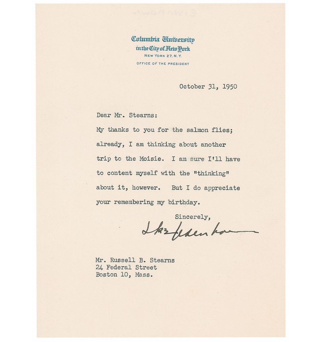 TLS signed “Ike Eisenhower,” one page, 5.75 x 7.75, Columbia University letterhead, October 31, 1950. Letter to Russell Stearns, in full: “My thanks to you for the salmon flies; already, I am thinking about another trip to the Moisie. I am sure I’ll have to content myself with the ‘thinking’ about it, however. But I do appreciate your remembering my birthday.” In fine condition. A pristine letter bearing a less commonly seen form of Eisenhower’s signature.