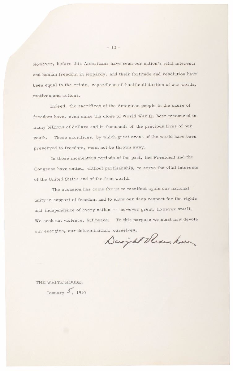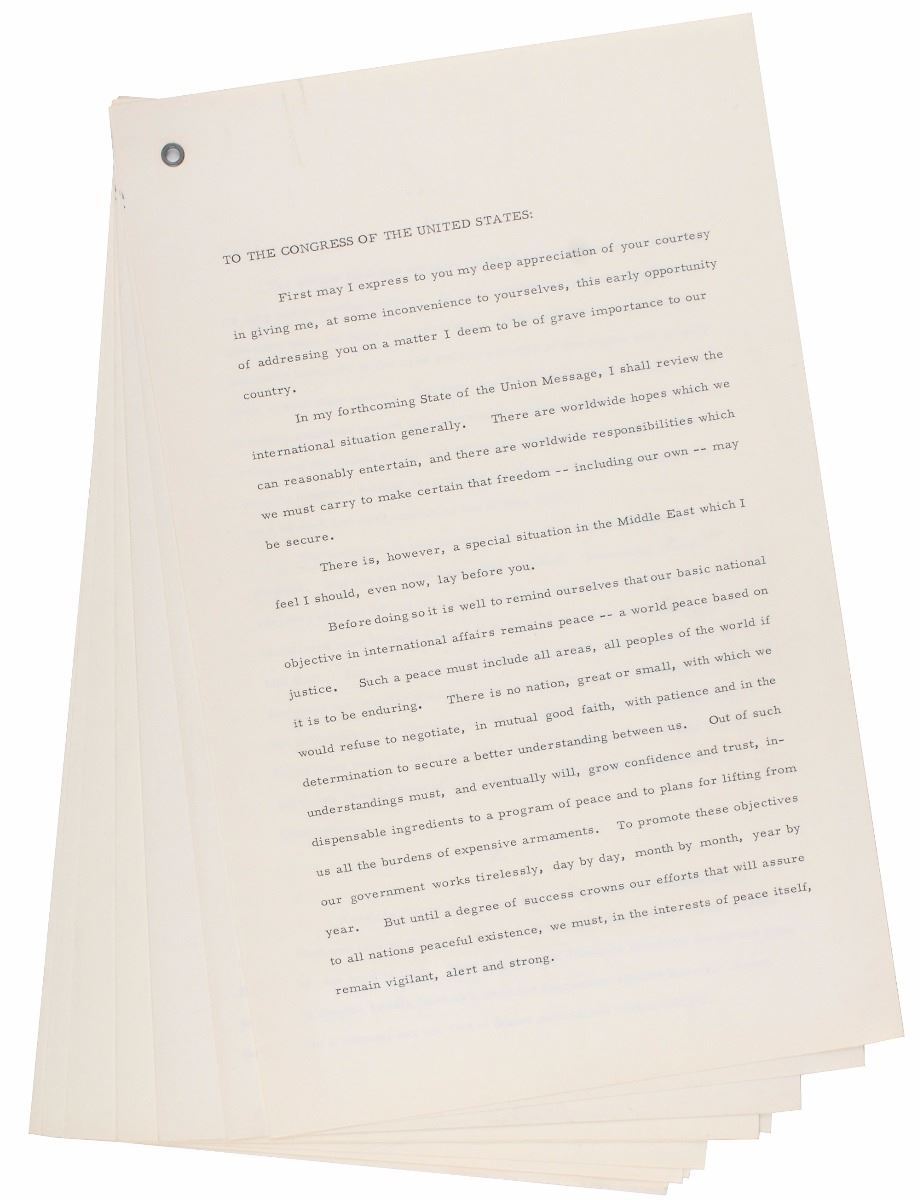 Exceedingly rare TMS, thirteen pages, 8.25 x 13.25, January 5, 1957. An original manuscript of the important address to Congress in which he proposed the ‘Eisenhower Doctrine,’ typed on official legal paper watermarked with the presidential seal. In part: “The Middle East has abruptly reached a new and critical stage in its long and important history…Since the First World War there has been a steady evolution toward self-government and independence…The evolution to independence has in the main been a peaceful process. But the area has been often troubled. Persistent crosscurrents of distrust and fear with raids back and forth across national boundaries have brought about a high degree of instability in much of the Mid East…Russia's rulers have long sought to dominate the Middle East…The reason for Russia's interest in the Middle East is solely that of power politics. Considering her announced purpose of Communizing the world, it is easy to understand her hope of dominating the Middle East… The action which I propose would have the following features…It would, first of all, authorize the United States to cooperate with and assist any nation or group of nations in the general area of the Middle East in the development of economic strength dedicated to the maintenance of national independence…undertake in the same region programs of military assistance and cooperation with any nation or group of nations which desires such aid…to include the employment of the armed forces of the United States to secure and protect the territorial integrity and political independence of such nations, requesting such aid, against overt armed aggression from any nation controlled by International Communism.” In fine condition.