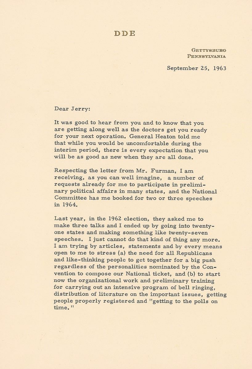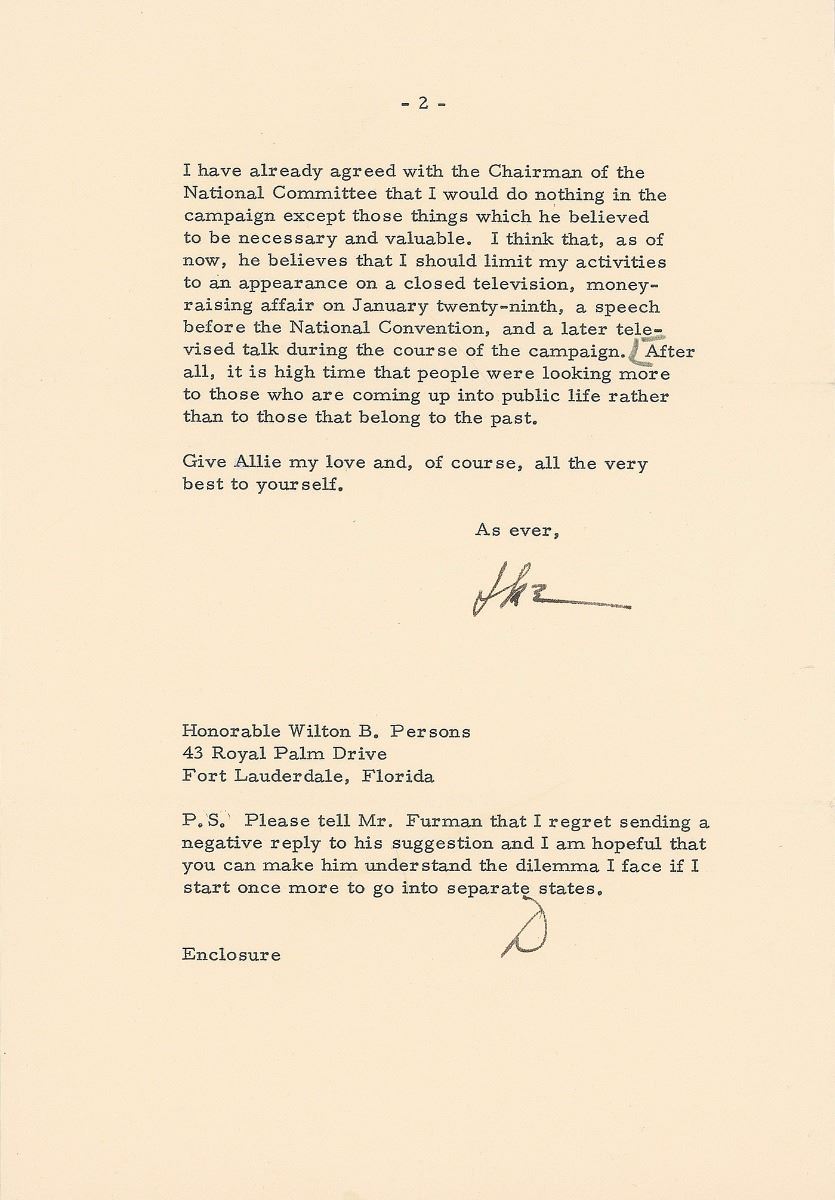 TLS signed “Ike,” two pages, 7 x 10.25, personal letterhead, September 25, 1963. Letter to his White House Chief of Staff, Wilton Persons. In part: “I am receiving, as you can well imagine, a number of requests already for me to participate in preliminary political affairs in many states, and the National Committee has me booked for two or three speeches in 1964. Last year, in the 1962 election, they asked me to make three talks and I ended up by going into twenty-one states and making something like twenty-seven speeches. I just cannot do that kind of thing any more. I am trying by articles, statements and by every means open to me to stress (a) the need for all Republicans and like-thinking people to get together for a big push regardless of the personalities nominated…and (b) to start now the organizational work and preliminary training for carrying out an intensive program of bell ringing, distribution of literature on the important issues, getting people properly registered and ‘getting to the polls on time.’” He adds a short postscript at the conclusion, initialed “D,” apologizing for declining the request for an appearance. In fine condition. The 1964 election put the incumbent Lyndon B. Johnson against Republican nominee Barry Goldwater, and Eisenhower stayed true to his sentiments in this letter by publicly backing Goldwater despite his past harsh criticisms of the Eisenhower administration.
