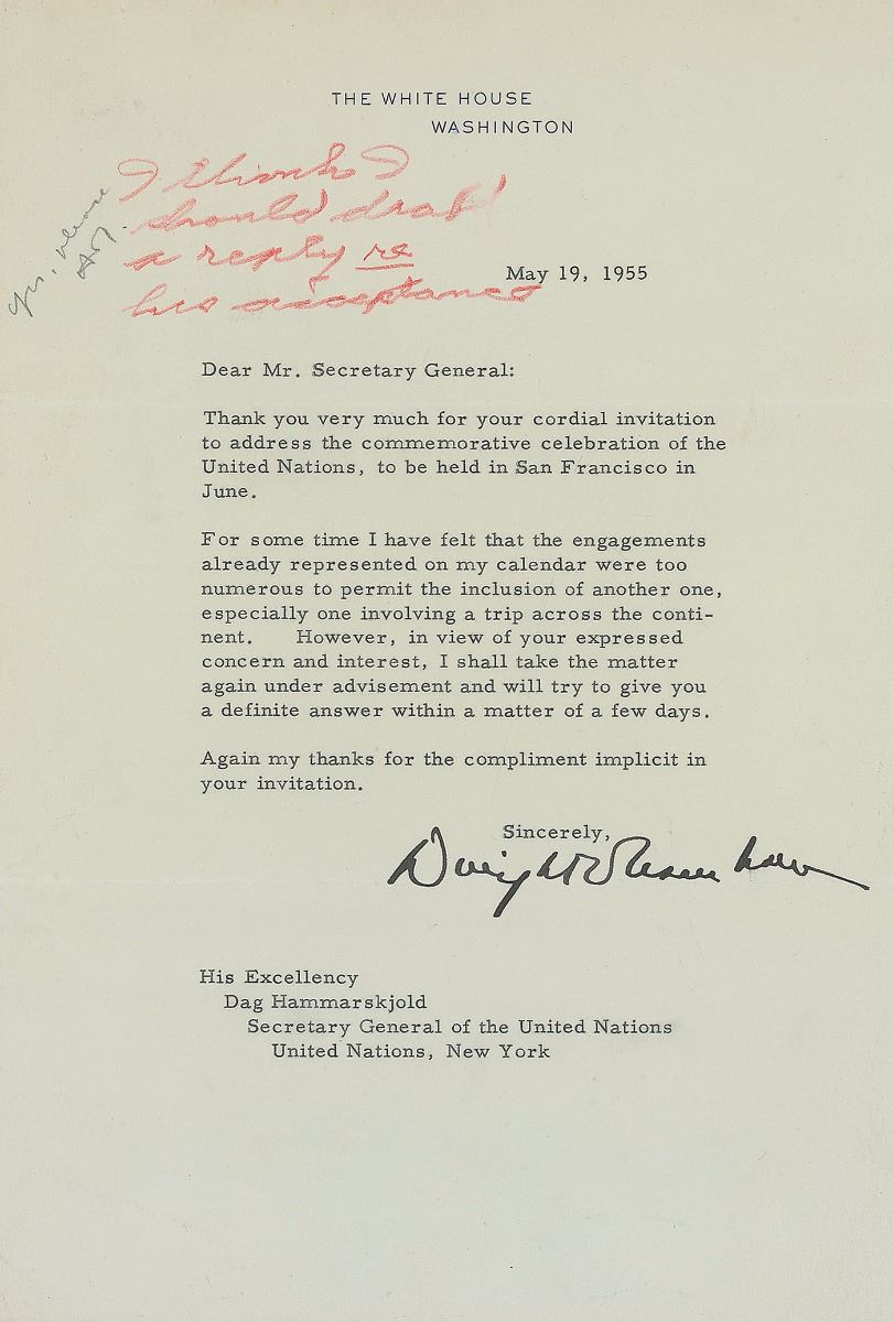 TLS as president, one page, 7 x 10.25, White House letterhead, May 19, 1955. Letter to Dag Hammarskjold, Secretary General of the United Nations. In part: “Thank you very much for your cordial invitation to address the commemorative celebration of the United Nations, to be held in San Francisco…I have felt that the engagements already represented on my calendar were too numerous to permit the inclusion of another one, especially one involving a trip across the country. However, in view of your expressed concern and interest, I shall take the matter again under advisement and will try to give you a definite answer within a matter of a few days.” Hammarskjold added a pencil notation at the top, “Yes, please. Hld.,” in response to an office note about drafting a reply. In fine condition. The celebration was held in honor of the tenth anniversary of the signing of the UN Charter, and Eisenhower did indeed attend; he gave a nationally broadcast speech calling for the world to abandon warfare and unite to battle poverty and disease.