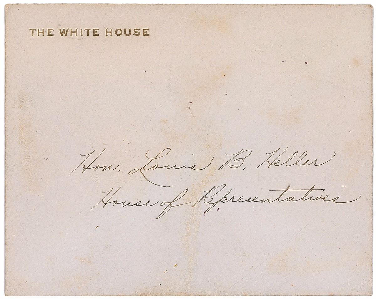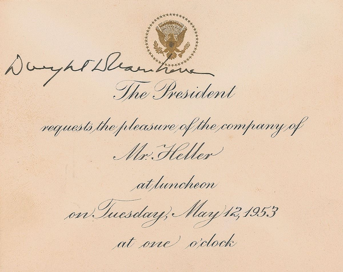 Official engraved White House invitation card for a luncheon on May 12, 1953, one page, 5 x 4, signed at the top in fountain pen as president, “Dwight D. Eisenhower.” The invitation is filled out in another hand for “Mr. Heller,” the Democratic Congressman Louis B. Heller. Light overall toning and a toned tape remnant to reverse, otherwise fine condition. Accompanied by the original transmittal envelope. This luncheon marked the last of a series of twenty-five that the newly inaugurated Eisenhower held so that he could meet the members of Congress on an ‘informal basis.’