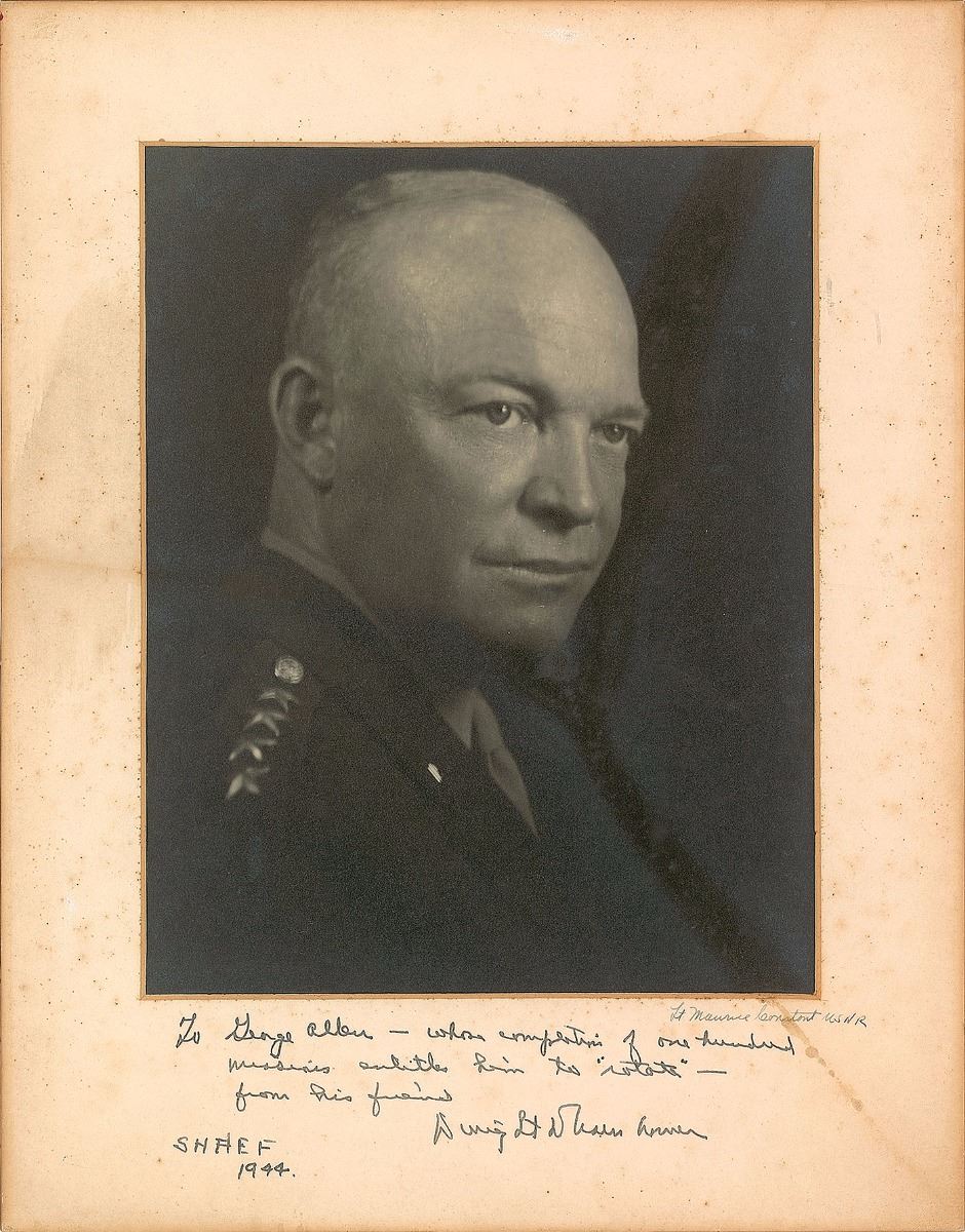 World War II–dated matte-finish 7.5 x 9.5 portrait of Ike in his four-star uniform, presented in a 10.75 x 13.75 mat, signed and inscribed on the mount in fountain pen, “To George Allen—whose completion of one hundred missions entitles him to ‘rotate’—from his friend, Dwight D. Eisenhower, SHAEF 1944.” In very good condition, with scattered foxing, staining, and toning to mat. An unusual pose with a wonderful wartime inscription.